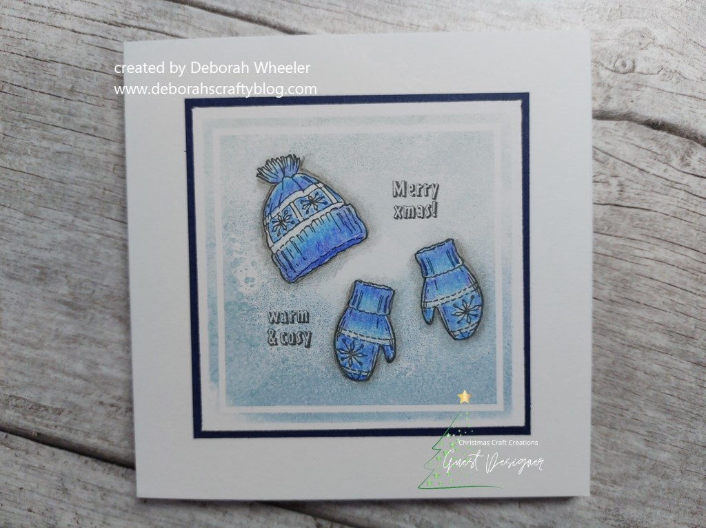What a cute design, Deborah and indeed, how many hats, gloves will be given during this Christmas season? More than plenty, I suspect. They certainly make a charming design for a holiday card and I love your square card design Thanks for being guest DT for CCC this month!