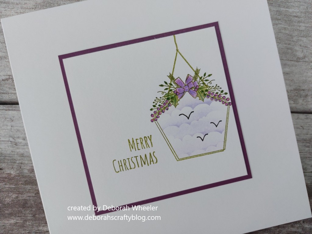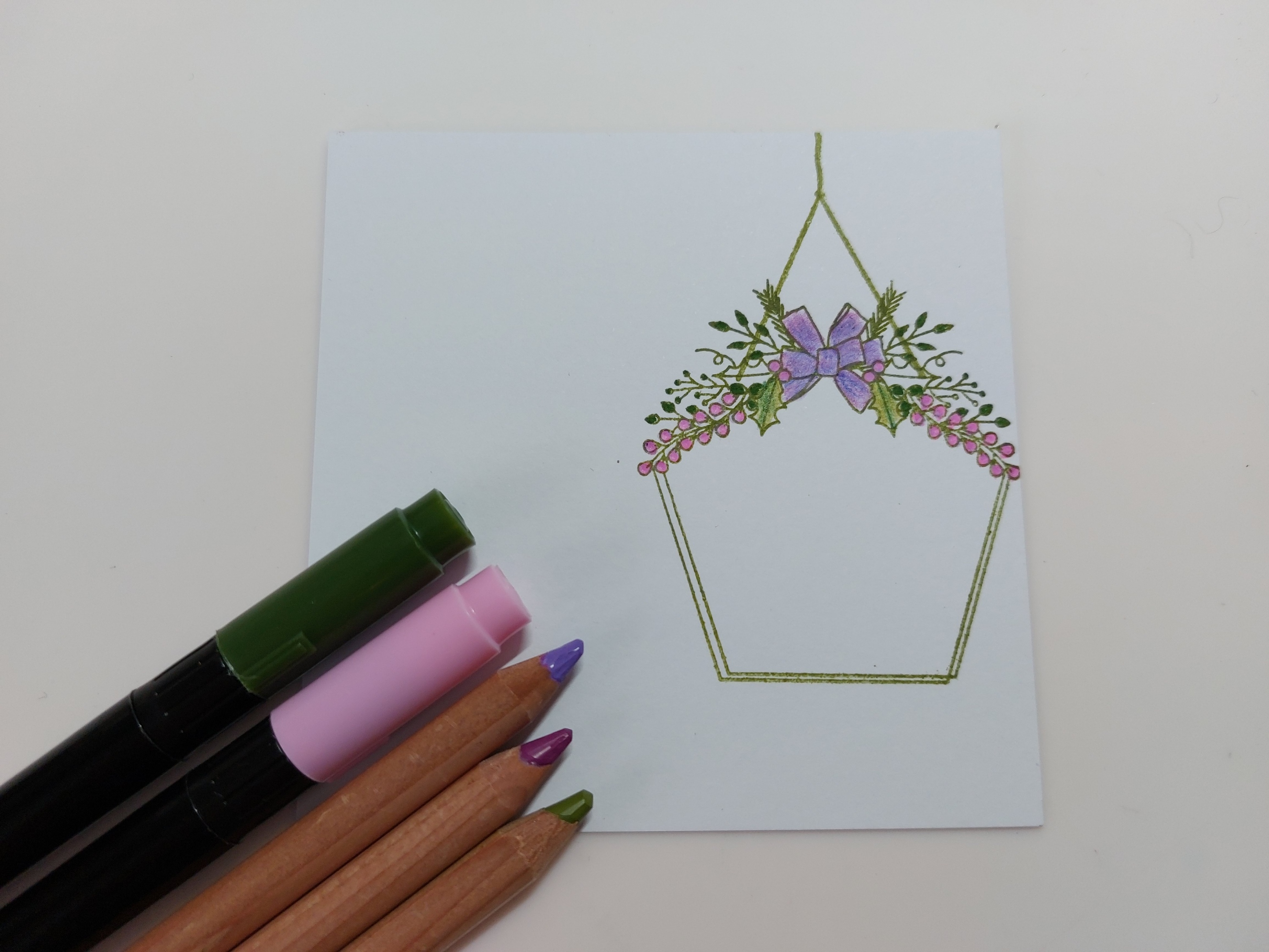 I’ve used the pentagon shaped wreath from the set for this card and started by stamping it with ‘fern green’ Archival ink at the side of a square of stencil card that I’d cut to fit a 6×6 card blank. I added the hanger in the green and then used a combination of Pergaliner pencils and Pergacolour pens to colour in the image, blending them together to get the right tones.