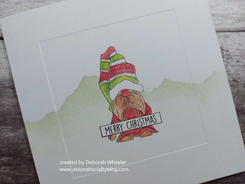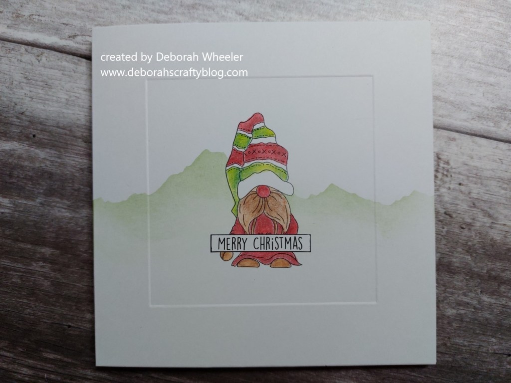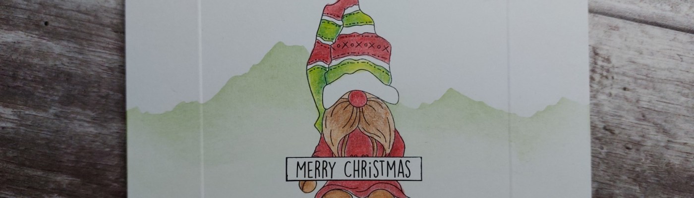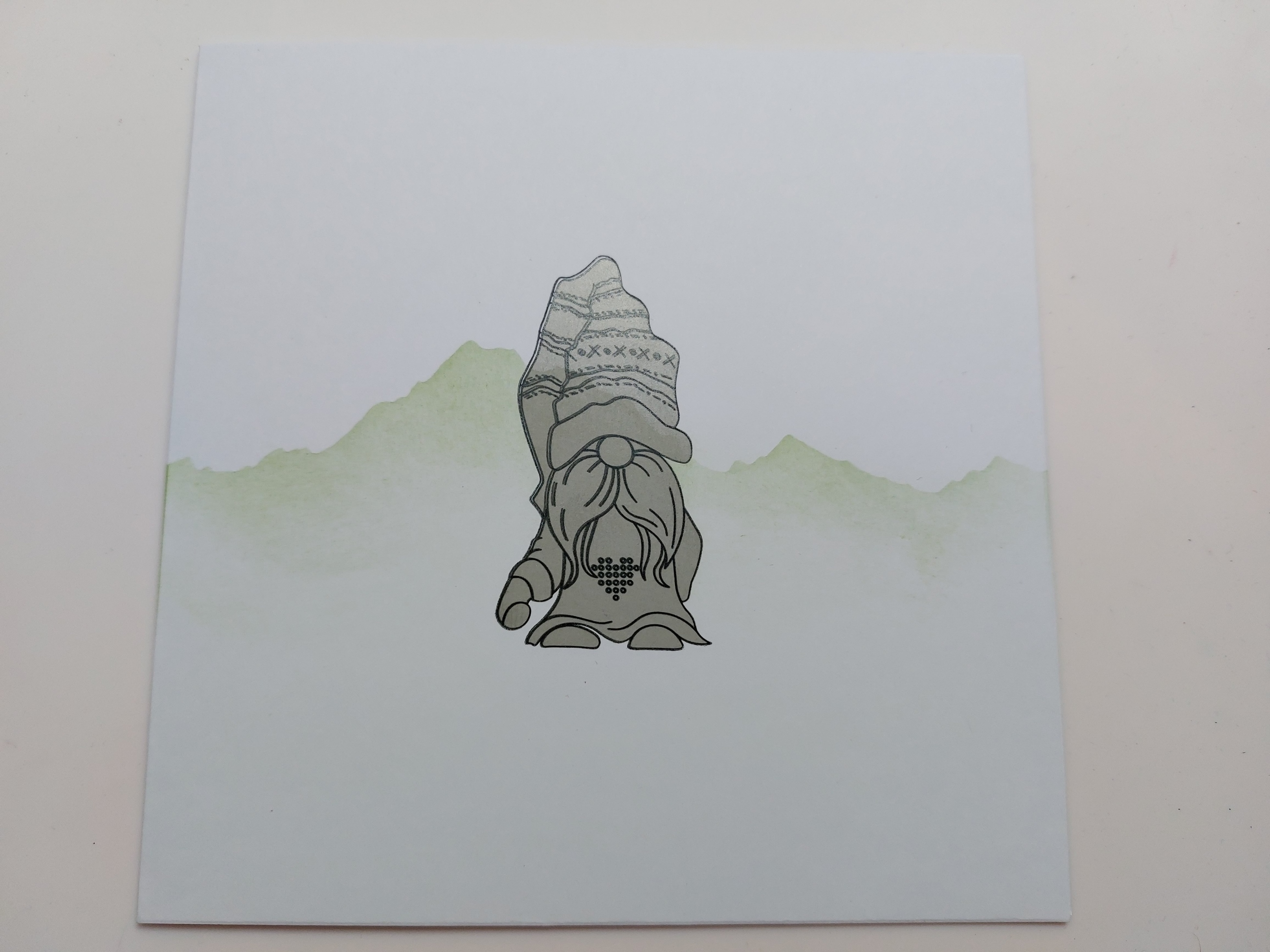 I stamped the gnome in the centre of a 6×6 card blank, covered him with the pre-cut mask that comes with the stamps, laid Clarity’s mountains mask across the centre of the card and lightly brushed ‘mowed lawn’ Distress Oxide across it. I lifted the mask off and coloured the gnome with Pergaliner pencils (I always blend two tones of each colour so I can get shade on the image)