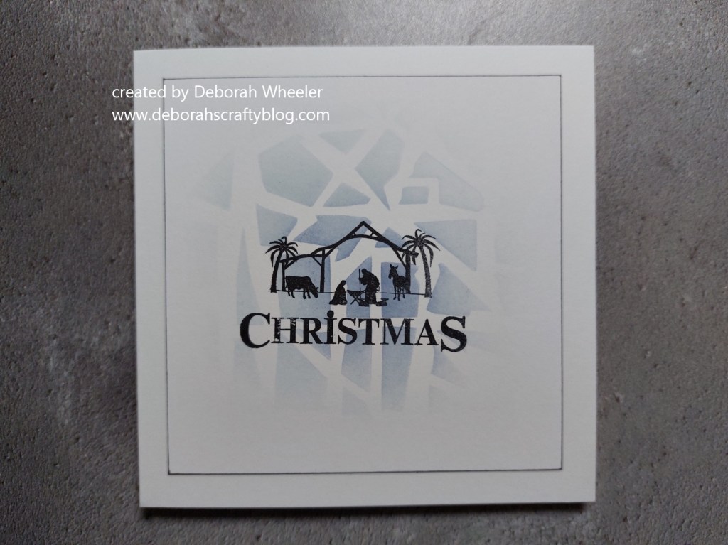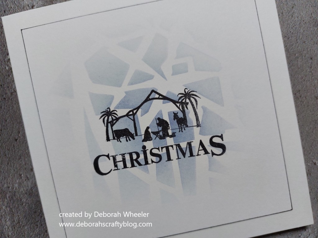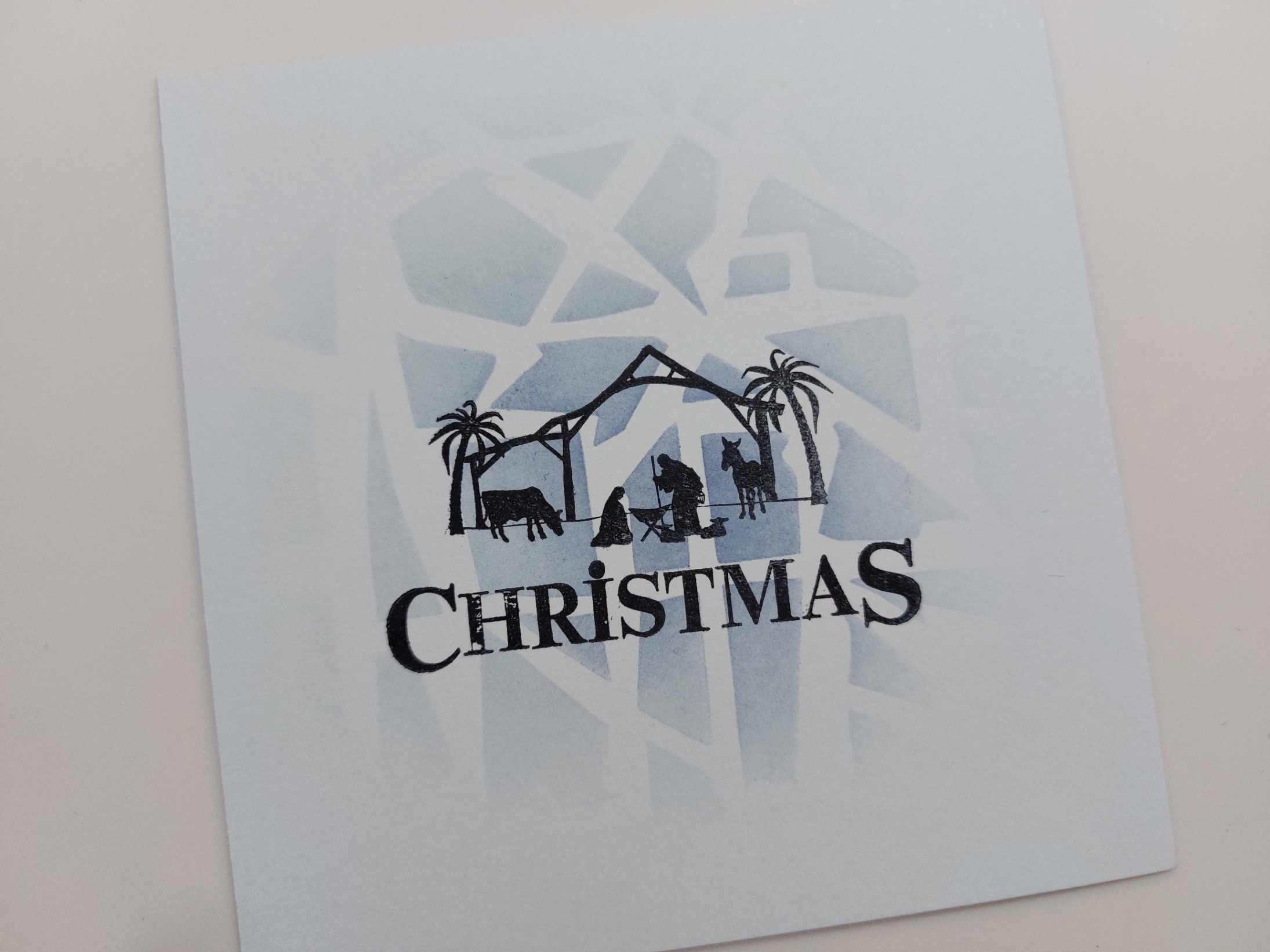 I strated by gently brushing ‘chipped sapphire’ and ‘specked egg’ Distress Oxides through the stencil onto the centre of a small square of card, before stamping the two images on top with black Archival ink. The abstract pattern from the stencil made me think of a map of the streets of Bethlehem…