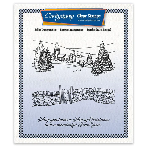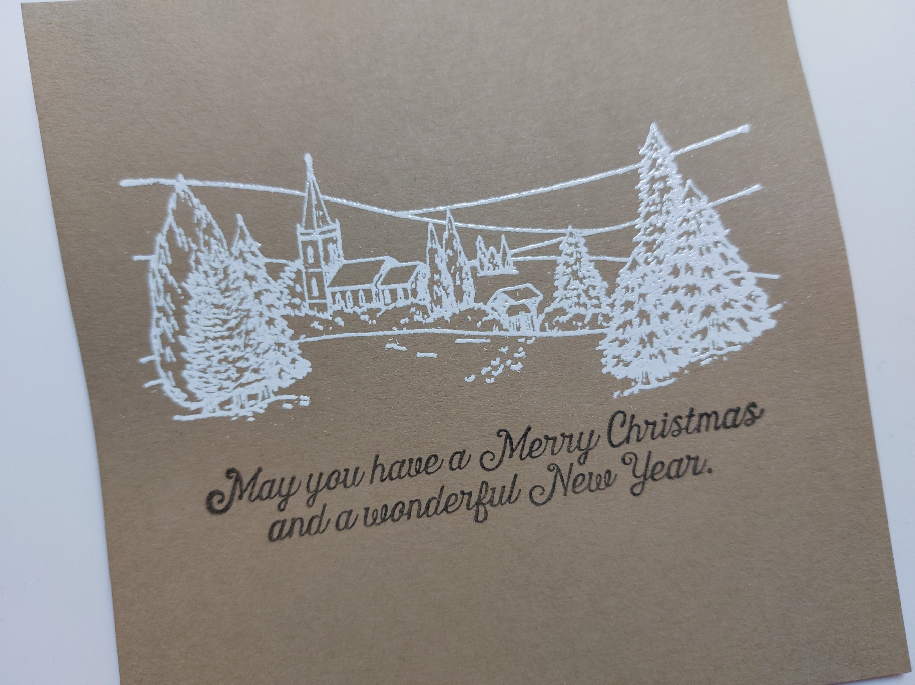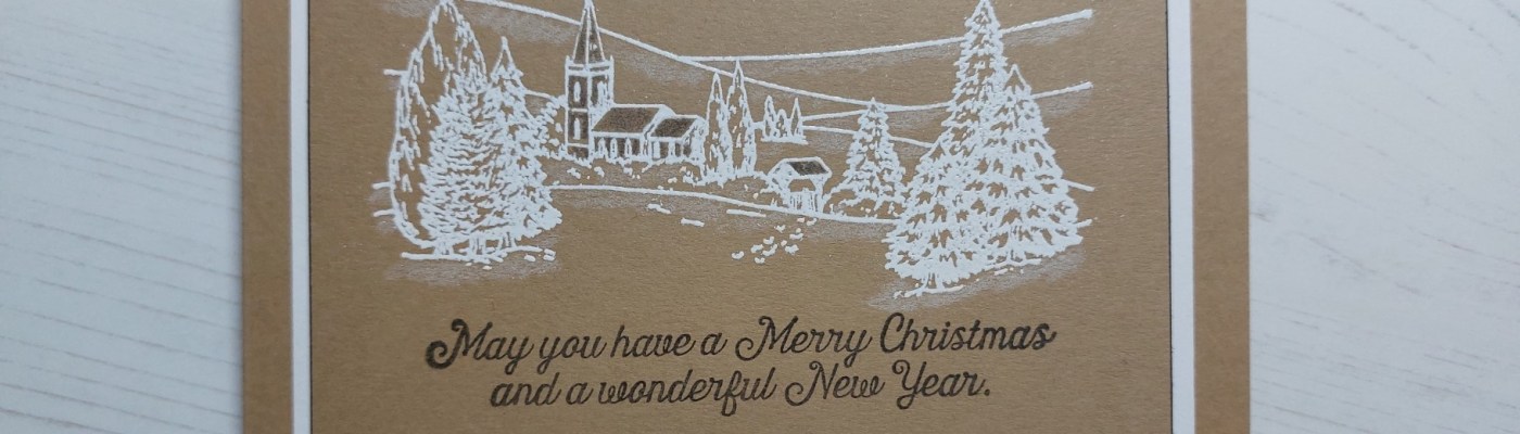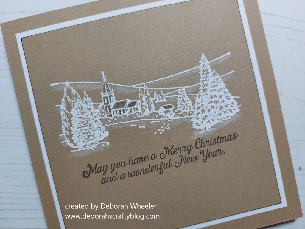 I stated with a square of kraft card, stamped the scene onto it with clear ink and heat embossed it with WOW’ white powder, before adding the sentiment in ‘watering can’ Archival ink. I then shaded in the church with a dark grey Polychromo pencil, using a white Pergamano pencil to add snowy shading across the hills and under the trees.