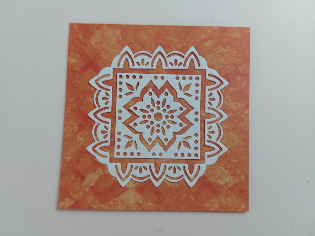 I kept it very simple with this one and let the dies do all the work as they’re so pretty! I started by cutting the full set out of white card, then attached all three pieces onto a square of ‘Toffee Apple’ designer paper.