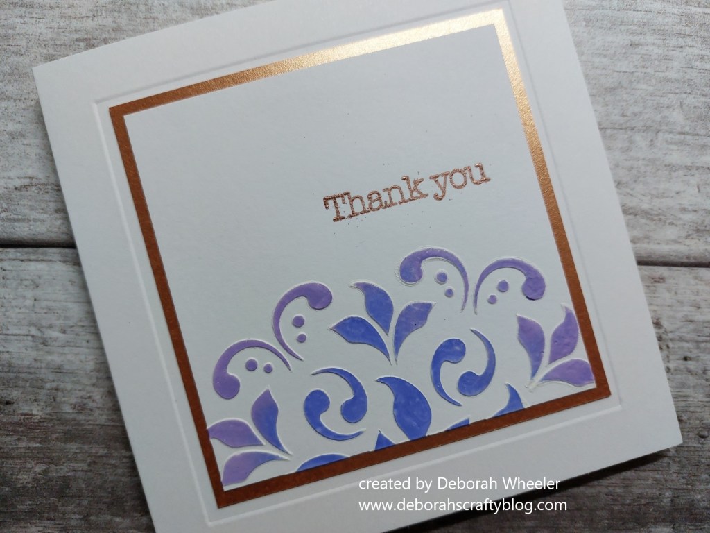 I started by attaching the stencil to a small square of card, so that the design just sat along the bottom edge, and then spread Pentart’s Primer Paste through it with a spatula. I carefully lifted the stencil off and washed it in warm water, leaving the paste to dry on the card for about an hour. Once dry, I put the clean stencil back over the paste and sponged ‘blueprint sketch’ and ‘shaded lilac’ Distress Oxides onto it. Once again I needed to leave the ink to dry as the paste is less porous than card, but then I could stamp the sentiment in clear ink and heat emboss it with WOW’s metallic copper powder.