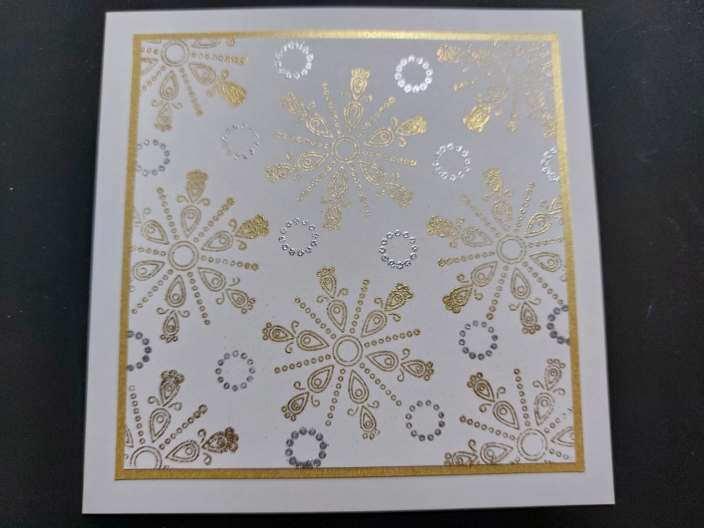 I started by heat embossing the large stamp with WOW’s superfine gold metallic powder several times onto a square of stencil card. I then stamped the small round circles image into the gaps and heat embossed that with metallic silver. I added a mount of gold card and attached it to a 6×6 card blank.