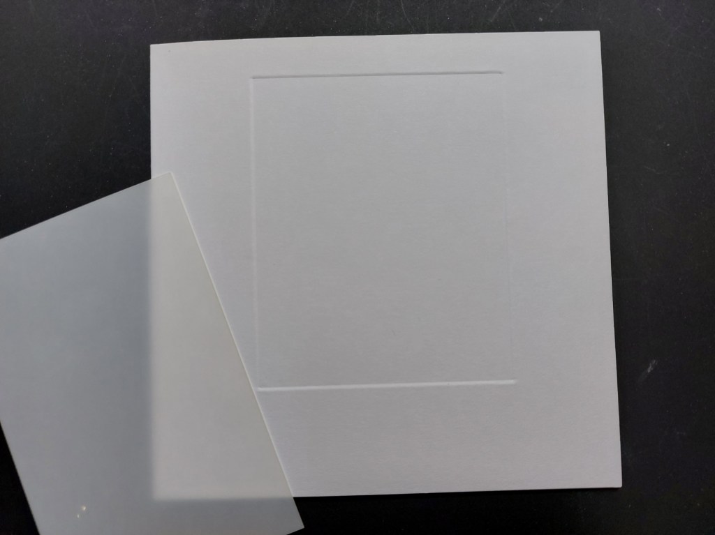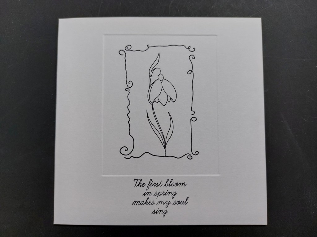 So, after all that preamble, on to my card! I started with a rectangular embedded frame on the front of a 5×5 card blank. Now the smallest of Clarity’s rectangle embedders was longer than I wanted, as I planned to put the sentiment outside the frame. I worked out how to shorten it, though! I lined up the embedder at the top of the card, then used my bone folder & ball tool to emboss round the top edge and part of each side. I then repositioned the embedder on the front of the card, lining it up with the embossed sides but moving it upwards over the top of the card. Turning back to the inside front, I could then emboss the rest of the sides and across the bottom edge. It was then simple to stamp the snowdrop panel into the frame and add the sentiment below it.