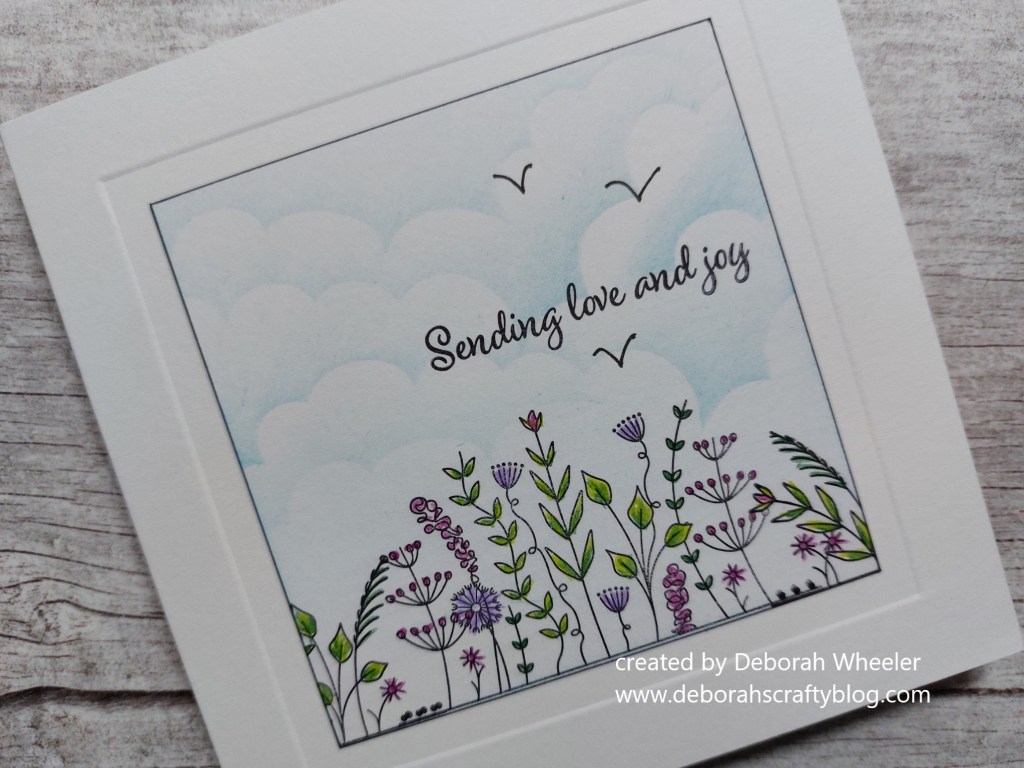 Hello everyone. I’m sharing another of my design team samples for the new ‘floral panel’ stamps from ClarityCrafts that I launched on Create & Craft TV yesterday – this time it’s the ‘with love’ set teamed with their clouds mask. This card picks up purple, love sentiment & birds from Festive Friday‘s inspo list, plus the sky theme from Addicted to CAS