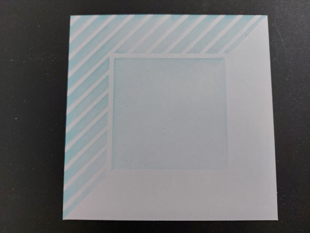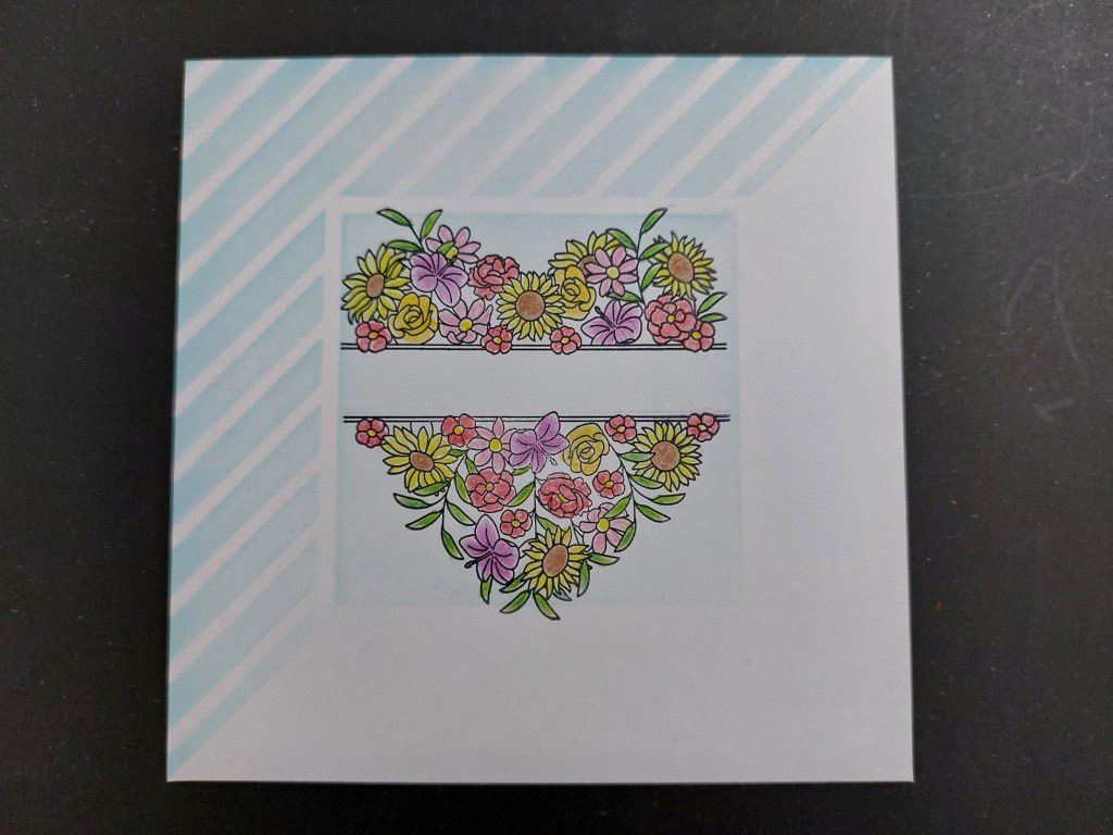 I started with the diagonal box stripe stencil on a square of card that I’d cut to fit a 6×6 card blank. I ran masking tape from corner to corner on the card, then blended ‘salvaged patina’ Distress Oxide through the stencil with a Clarity brush, sharpening up the edges with a spot-on sponge. I then removed the diagonal masking tape, laid the stencil back down and remasked around the sides of the inner square, putting the tape on the stencil this time along the right hand and bottom sides. I lightly brushed a little more of the ‘salvaged patina’ into the central square, then stamped the two halves of the floral heart.
