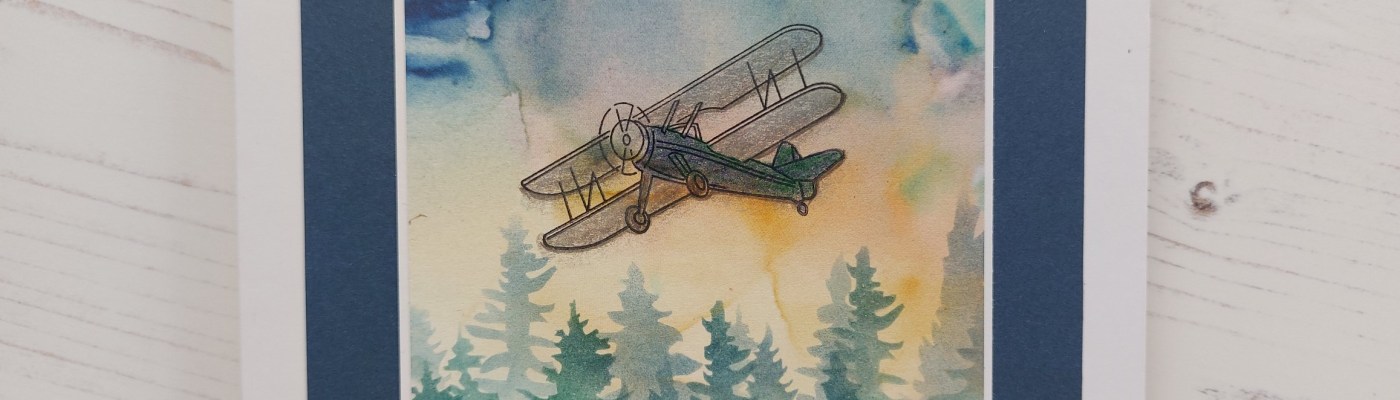 Hello crafty friends. Today’s card features another of the images from ClarityCrafts‘ ‘Just wings and wheels’ stamp set – a fab little biplane. I used the ‘pine trees’ mask to create the tree tops, so I’ll be sharing with with the challenges at Just Us Girls and Addicted to Stamps, both of whom are looking for stencils on cards.