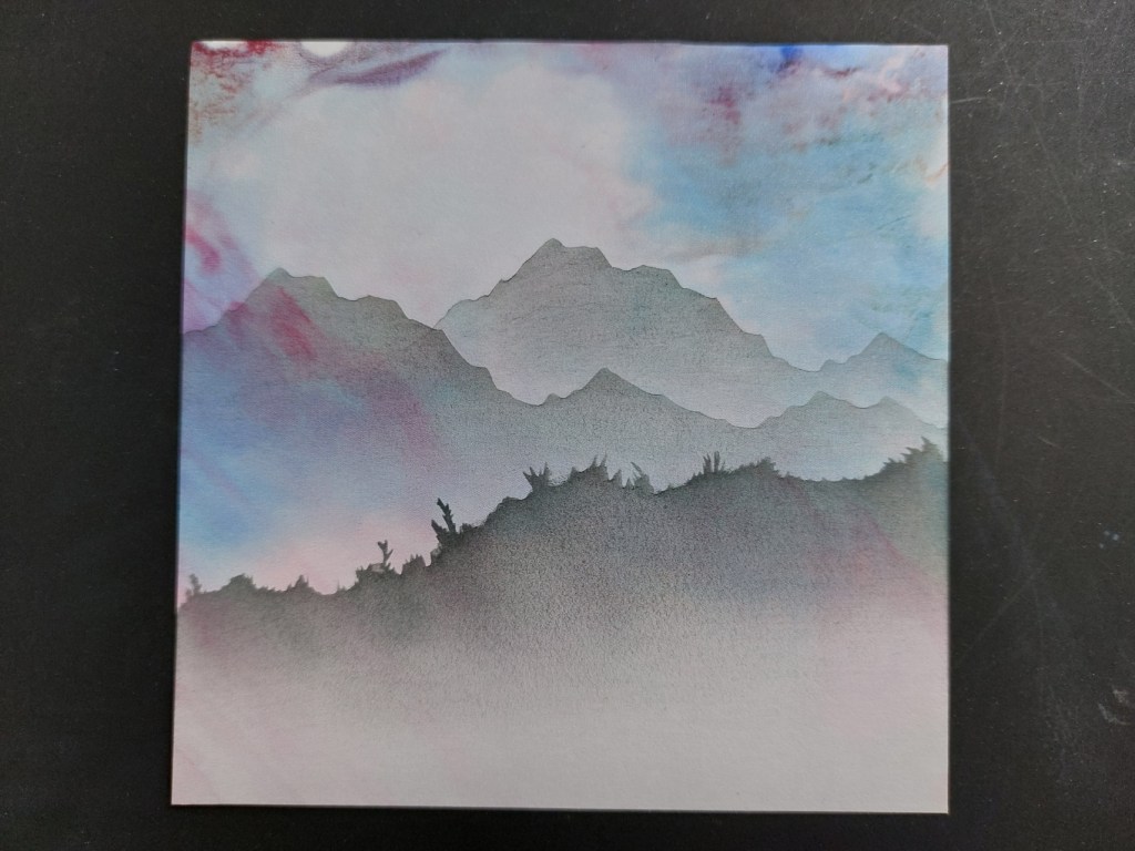 I started with a piece of ‘Barb’s favourite – Amazonia’ paper, then brush ‘black soot’ Distress Oxide through the grass mask from the ‘deerscape’ set. I switched to the ‘mountains’ mask and lightly brushed more of the ‘black soot’ through that, to create the landscape.