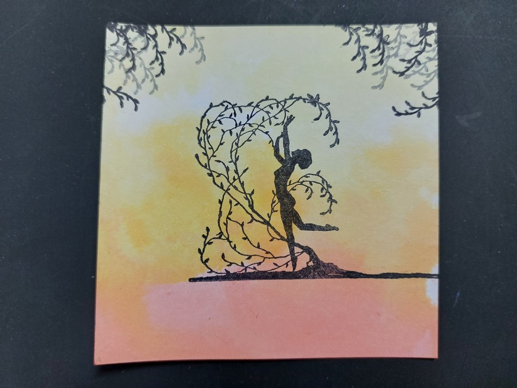 So I kept it simple on this one, picking out one of my inky mop-up backgrounds on a small square of stencil card (I think it might have ‘festive berries’, ‘carved pumpkin’ & ‘squeezed lemonade’ Distress Oxides on it). I stamped the ‘willow lady’ image in the centre with black Archival ink – then promptly dropped the ink pad on the top corner! I’d intended to stamp some leaves as a frame on the top anyway (which was lucky), so managed to cover it up by repeat stamping the top corner of the image, using first and second generation ink. I also extended the ‘island’ in the image out to the edge of the card using a micron pen.