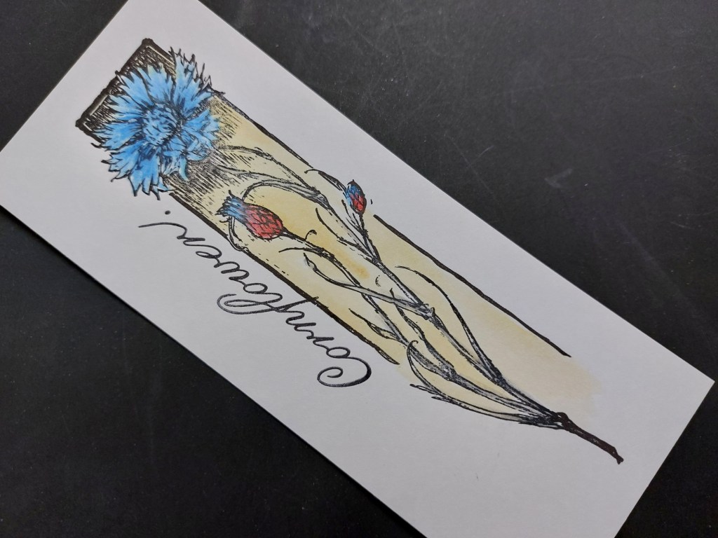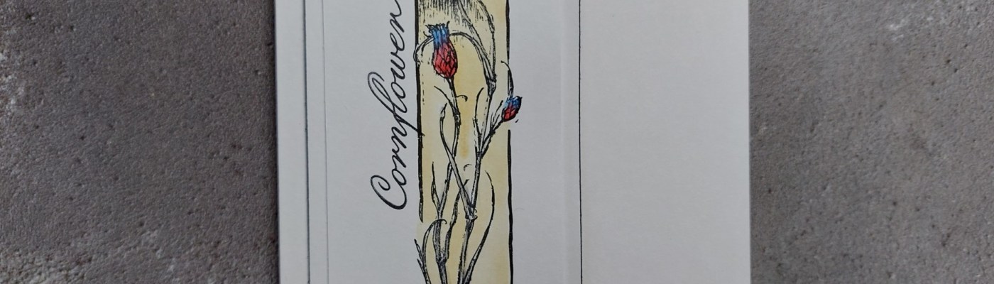 I’ve kept it very simple on this one (as always!), letting the stamp do all the work! I stamped the flower image onto a strip of white card (from my off-cuts box), then added the common flower name by masking off the Latin name on the stamp before inking it. I shaded the flower and buds with blue and red Pergaliner pencils, then use ‘scattered straw’ Distress Ink and a waterbrush to fill in the frame around the flower. It’s best to do it in that order, so the card is dry when you use the pencils.