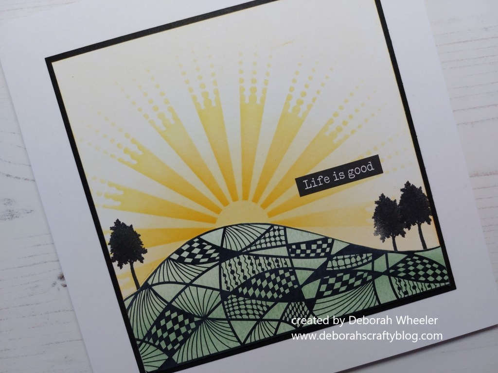 Hello crafty friends. Today’s card uses one of the new ‘doodleology’ postcards from ClarityCrafts – these co-ordinate with their existing collection of stamps & stencils. I’ve used the ‘square’ design postcard for this offering, cutting the card along one of the curves for my landscape.