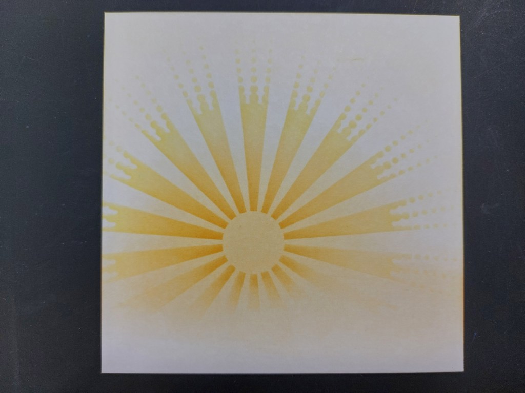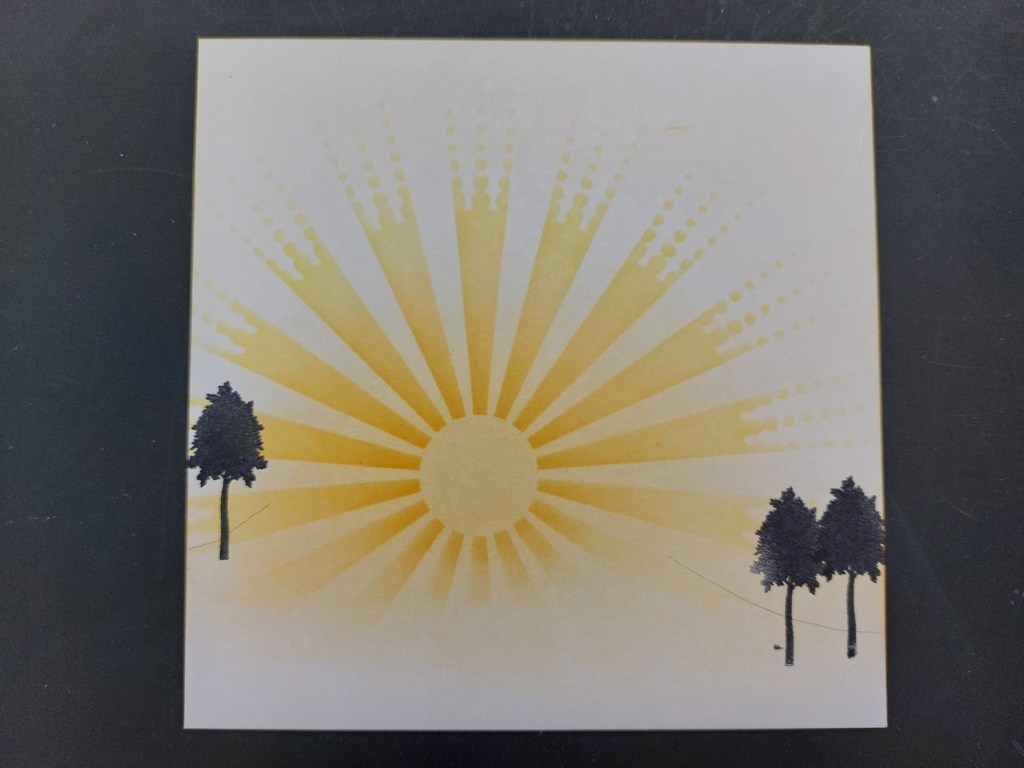 First, though, I created the sunrise on my card using the ‘sunshine’ stencil and brushing ‘carved pumpkin’ and ‘squeezed lemonade’ Distress Oxides through it onto a square of stencil card. I repeat stamped one of the ‘wee trees’ using black Archival ink.