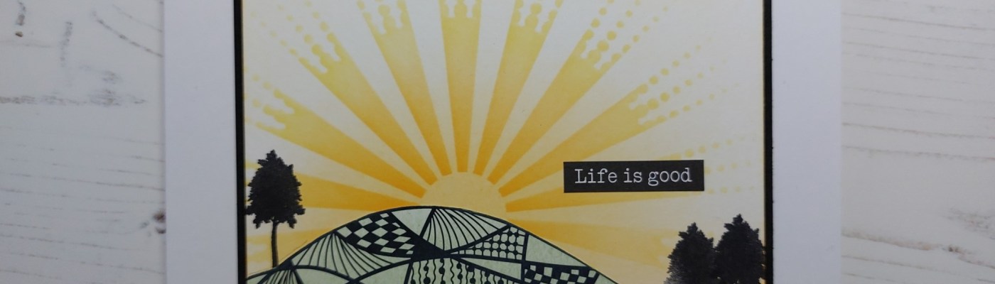 These postcards are great additions to Clarity’s range – lots of ways to use them. I’m going to share this with the challenge at Stencil Fun, though, courtesy of the sunshine behind the landscape!