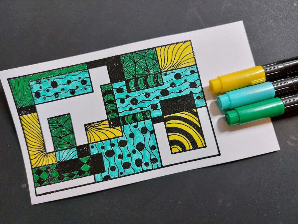 The first step was to stamp the large rectangle from the set with black Versafine Clair ink and heat emboss it with clear powder. I picked out three Pergacolour pens to match Color Dare’s palette and used them to fill in the blocks of pattern within the stamped image.