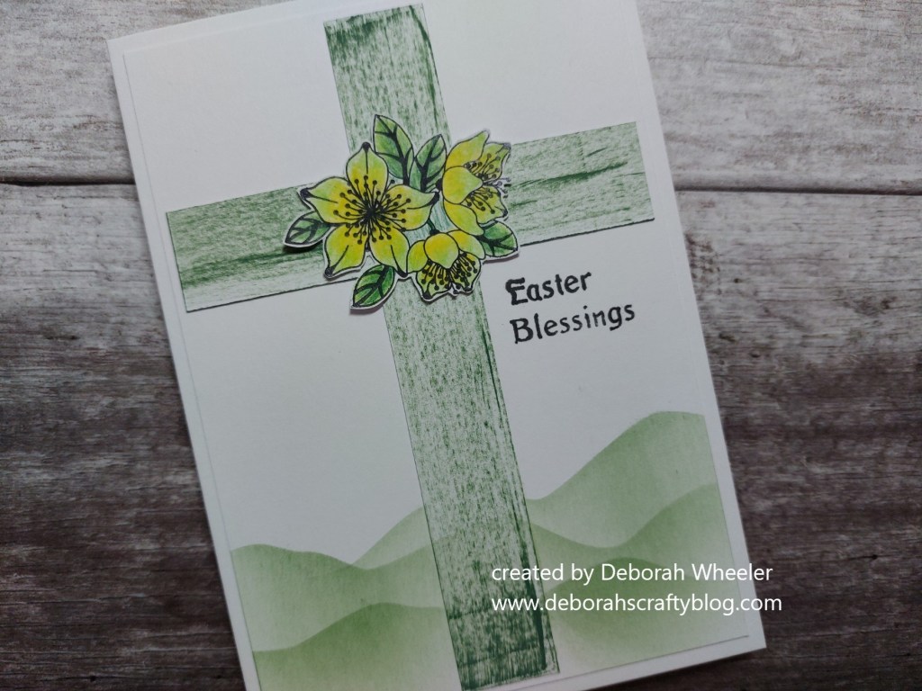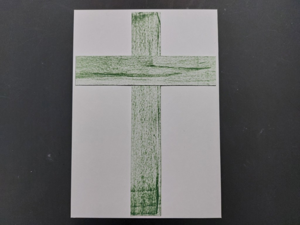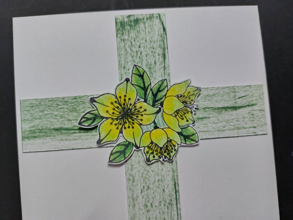 I decided to rotate the sketch from AHSC, so that I could use a cross as the basis for my design. I wanted a wood effect, so simply dragged a ‘rustic wilderness’ Distress Oxide pad across an offcut of white card – it’s so easy to do! I cut two strips and glued it to a piece of card cut to fit a 5×7 card blank. I stamped the flowers onto another scrap of card and coloured them with Pergaliner pencils in light green, dark green and yellow before fussy cutting it and gluing to the centre of the cross. Top tip – I didn’t want to elave a white background in the centre of the flowers, so just scribbled the dark green pencil to mimic the effect of the wood.
