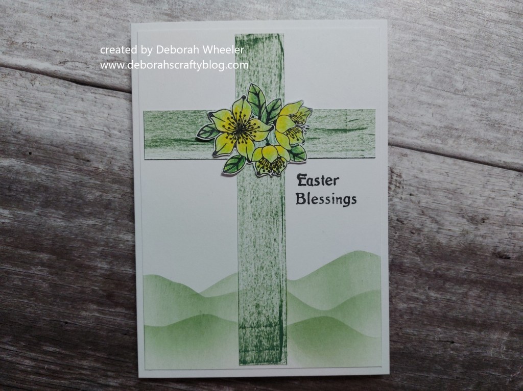 Now regular readers of this little blog will know that my favourite style is best described as ‘evolving’ – I’m not always very good at planning everythign before I start! That’s what happened here and I felt I needed a background for the cross, so reached for Clarity’s ‘hills’ mask. I ran masking tape down the cross and then brushed ‘rustic wilderness’ across the mask – as the hymn says ‘There is a green hill far away’ (or several!) I then simply added the sentiment (from the ‘essential’ set) in ‘watering can’ Archival ink and attached the topper to a 5×7 card blank.
