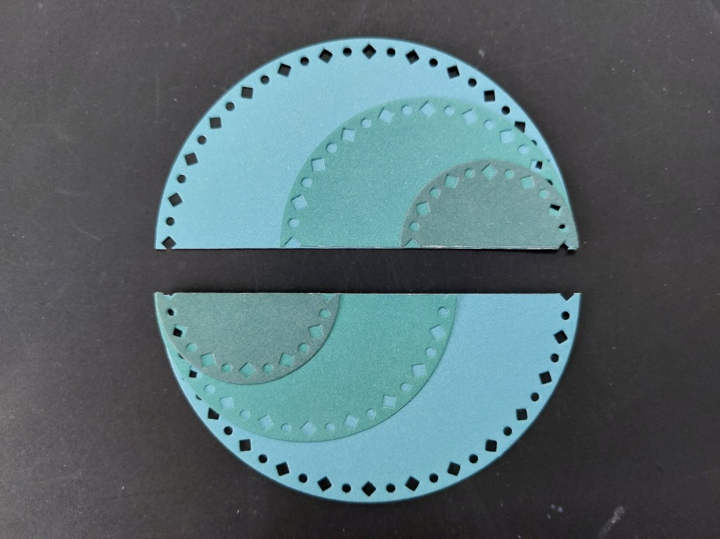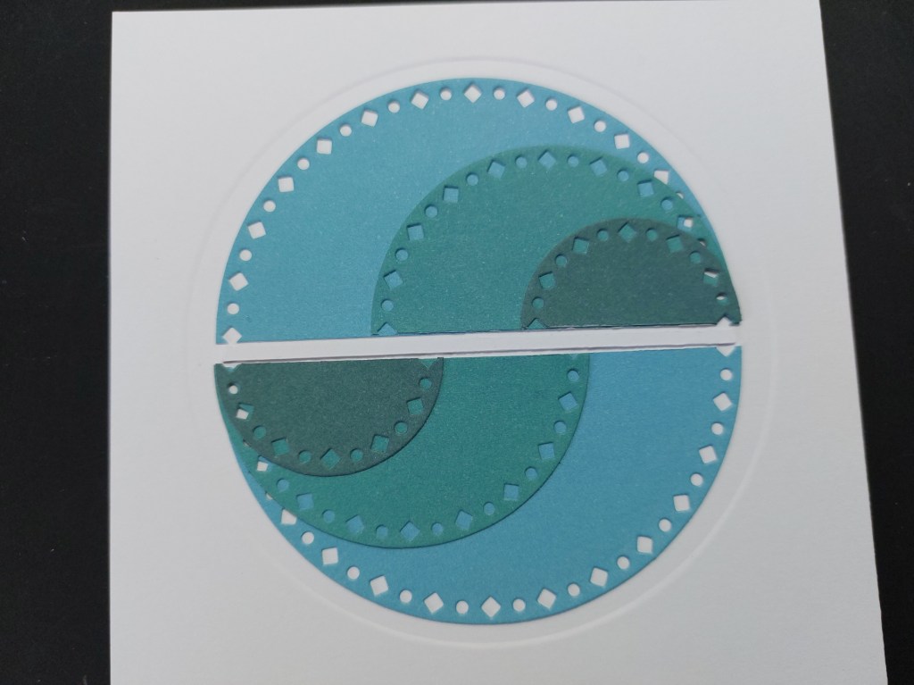 I first cut three mats with co-ordinating turquoise & green companion papers (Rainbow River, Waimea Falls & Indian Summer) starting with smallest die for the darker shade, then working outwards with the third and fifth smallest dies. I cut each of them in half and layered them up onto the largest one, offsetting them to the side.