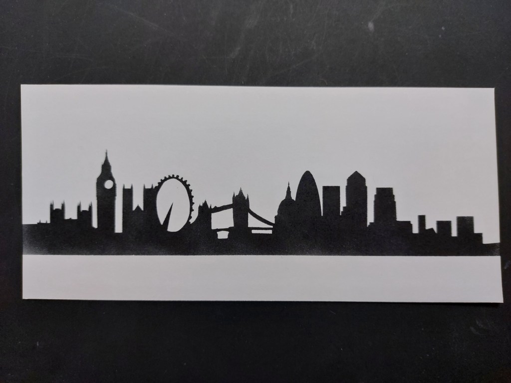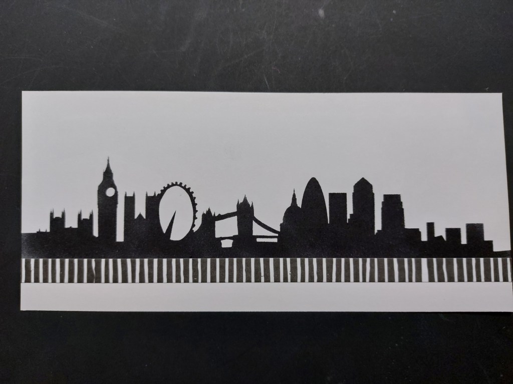 I started with a piece of card cut to fit on a UK DL size card blank and placed the upper part of the ‘London skyline’ mask onto it (I cut it across each side with scissors to separate it), adding in the additional little pieces for Tower Bridge, the London Eye & Big Ben and then running a strip of low tack tape along the bottom edge. I used a Versafine Clair ‘nocturne’ ink pad (nice and juicy!) and a spot-on sponge to fill in the image, just pounding the ink into the card. Once dry, I attached a strip of the BOW-WOB (Black on White – White on Black) collage paper across the bottom of the stencilled image.