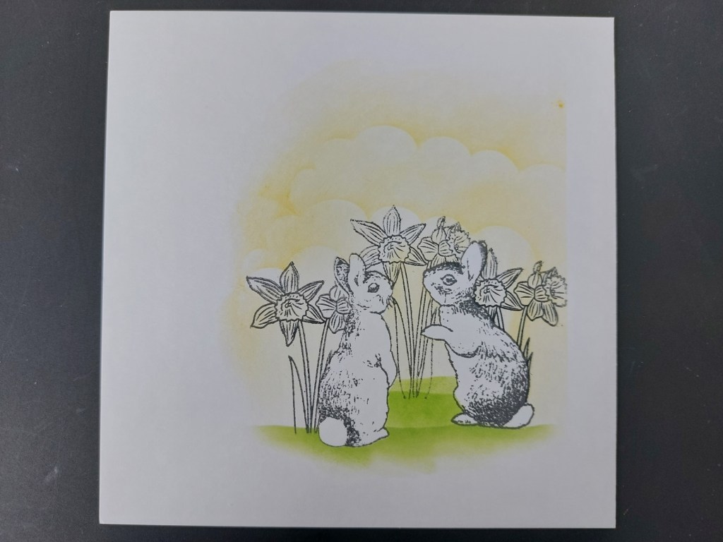 I kept the masks on the bunnies so I could add the sky by brushing ‘mustard seed’ Distress Oxide across the clouds mask and ‘mowed lawn’ for the ground. Out then came my trusty Pergaliners and I shaded in the daffs and bunnies.