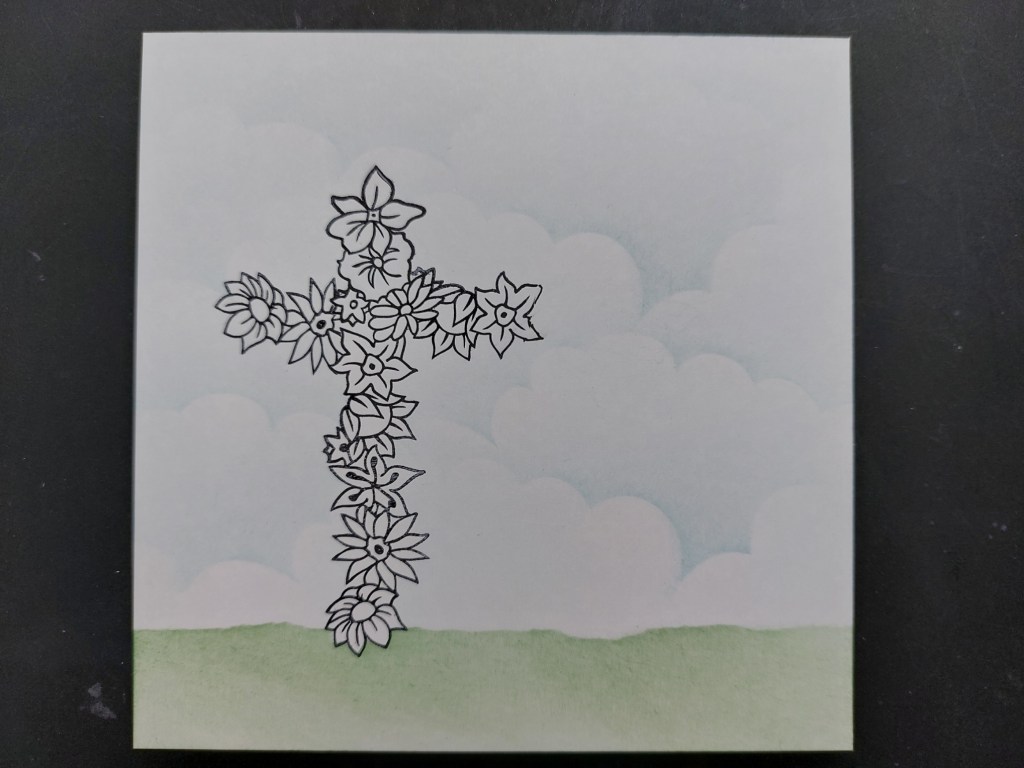 One thing I’ve learned this Easter is that you can make a cross out of any straight stamps, so I started with the floral strip from the set and stamped it on half a 5×5 card blank. I cut a mask for it from Clarity’s mask material and covered it over. I then stamped part of the floral strip for the hprozontal part fo the cross (the easiest way to do this is to pp a bit of masking tape over the part fo the stamp you don’t want to use before inking it up, then remove the tape and stamp it!) I left the mask in place so I could stencil the ground using torn copy paper and ‘rustic wilderness’ Distress Oxide, then added the sky with the clouds mask and ‘tumbled glass’.