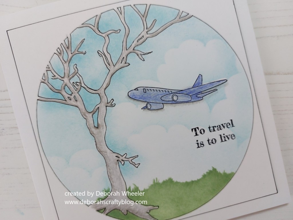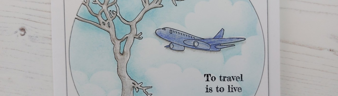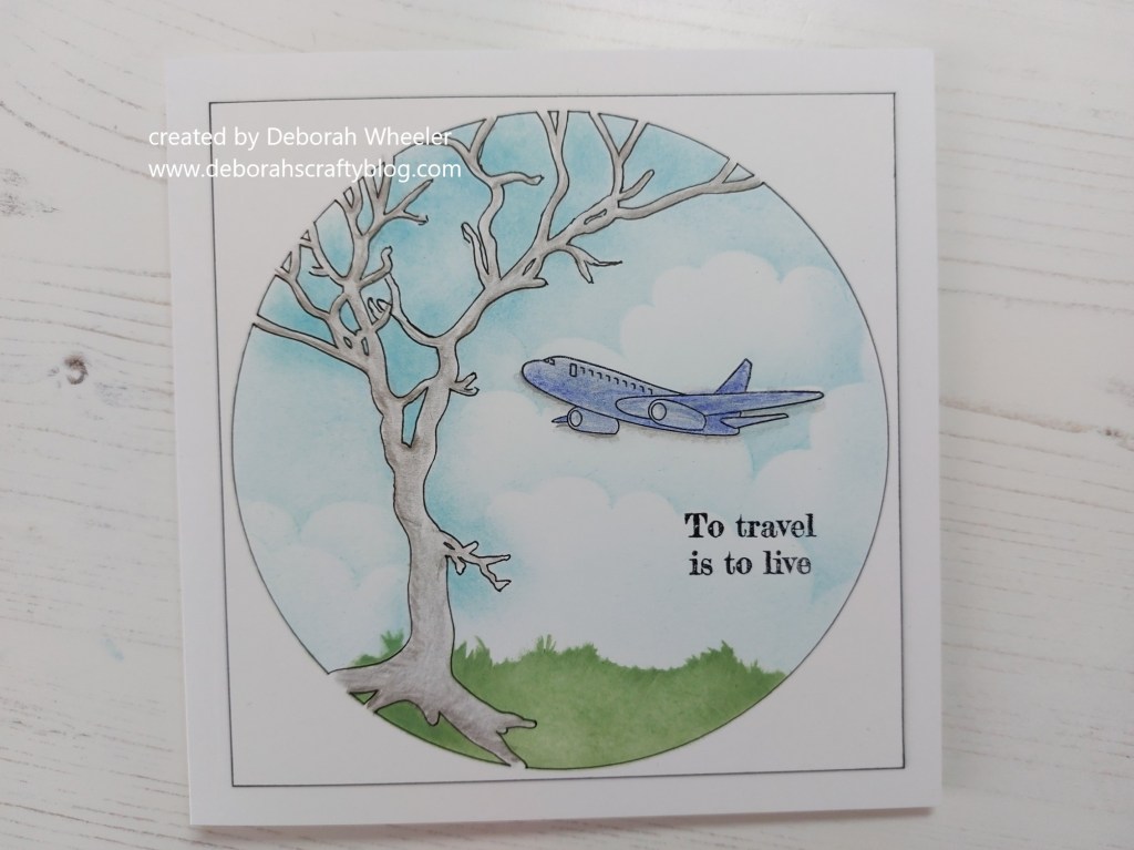 I was fortunate to spend a couple months last year travelling with friends in Australia & New Zealand, so today’s card is a nod back to our Grand Adventure. I decided to use the plane from ClarityCrafts‘ ‘wings & wheels’ set, sitting it with the ‘winter tree’ stencil and using three of the colours (the two blues and the green) from Color Dare‘s chart.