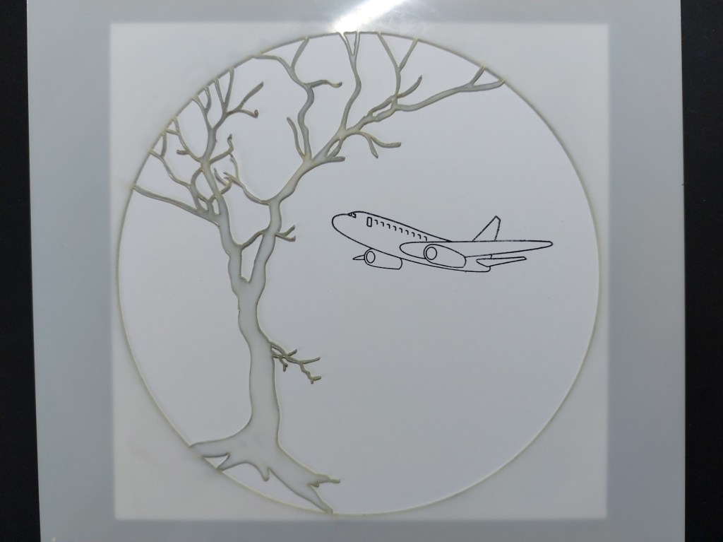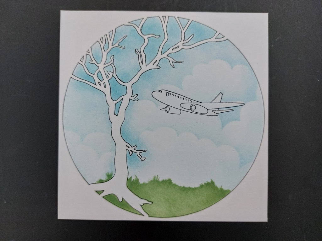 I started by positioning the stencil on card to fit a 6×6 card blank, stamped the plane into the aperture and masked it off with one I’d made earlier. I popped the upper part of the grass mask from the ‘deerscape’ set underneath the stencil and brushed ‘rustic wilderness’ Distress Oxide across it. I sponged ‘tumbled glass’ between the tree branches, then brushed it across the clouds mask into the aperture. The tree still wasn’t well defined, so I carefully traced around the stencil with a micron pen to outline it.
