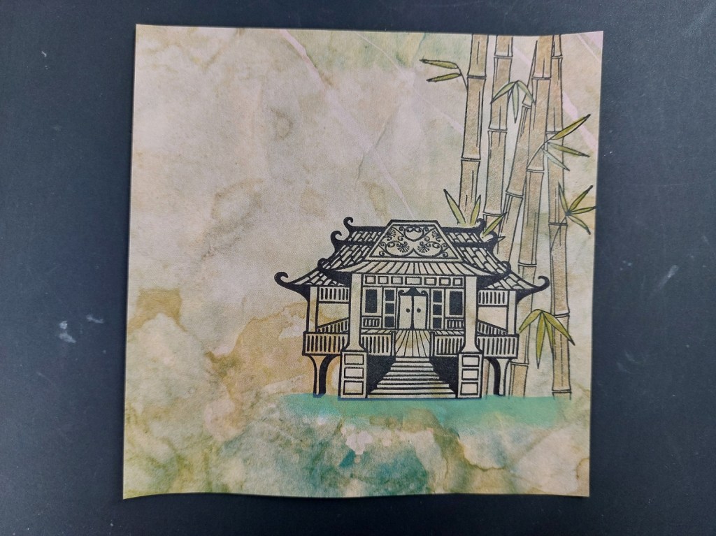 I cut a piece of the Infusions paper to fit on a 7×7 card blank and stamped the waterhouse onto it. After covering it with a mask, I added the bamboo to sit behind it, stamping the outline in black Archival ink, then the infill stamp which I’d sponged ‘walnut stain’ Distress Oxide onto, shading the leaves with an olive green Pergaliner pencil. I also sponged a little ‘peacock feathers’ and ‘walnut stain’ below the house to ground it.