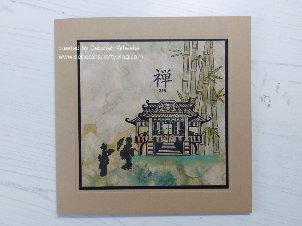 Welcome to another look at the new Japanese geisha stamp set from ClarityCrafts and a contrast in style to yesterday’s card, thanks to one of the Infusions papers. I must admit, I intially thought the waterhouse was a teahouse, so was going to make witty comments about the suitability of the designer paper, but never mind!