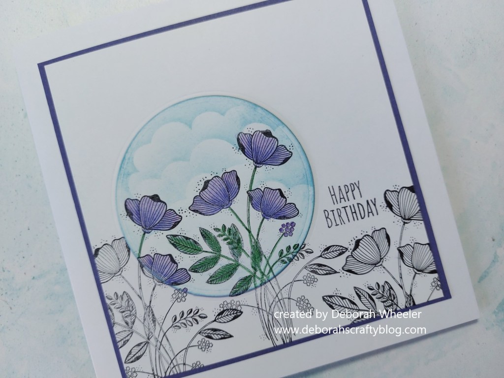 Hello crafty friends. Today’s card is another of my samples from Barbara’s TV shows yesterday, this time using one of my all-time favourite stamps, the A6 ‘Tina’s floral spray’ set. I went with the spotlight technique, taking inspiration from the photo at AAA Colourful; I’m also going to share it with Just Add Ink as I’ve used their colours of purple & green thanks to the flowers on top of the cake.
