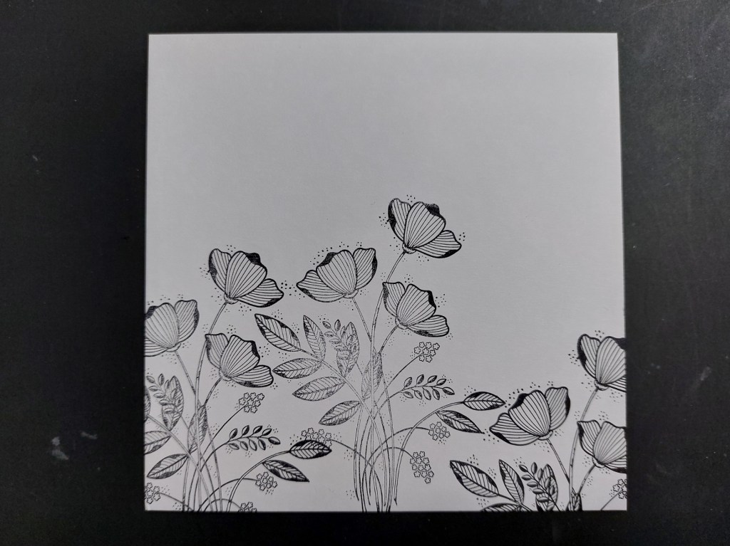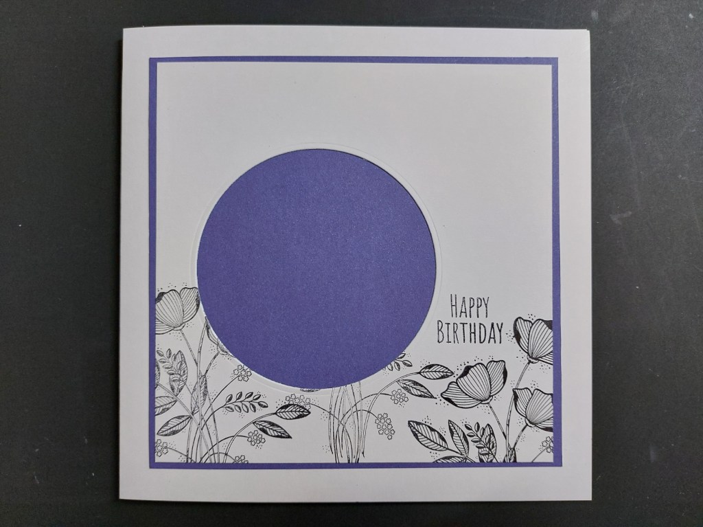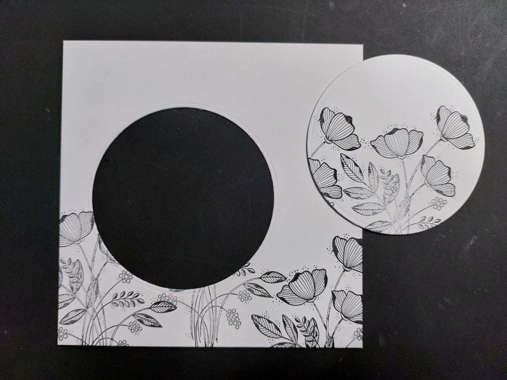 I started by stamping the floral spray outline three times onto half a 5×5 card blank (which was the right size for my topper), then used a nested circle die to cut out the area for my spotlight.