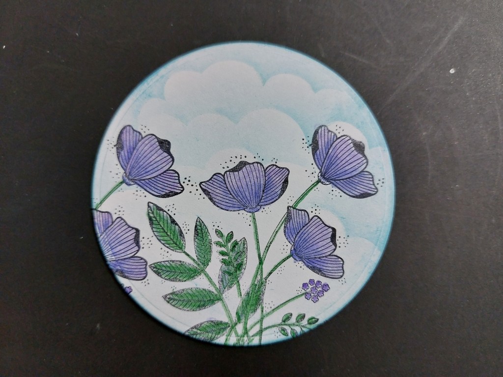 I mounted the topper onto a layer of Amazonia companion paper and attached it to a 6×6 card blank, adding the sentiment from one of the seasonal tags & frames sets. I then took the die cut circle and brushed ‘broken china’ Distress Oxide across the clouds mask for the sky, then used Pergaliner pencils to colour the flowers and leaves.