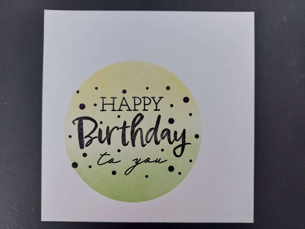 I started with half a 6×6 card blank, positioned the outer part of the ‘simple circle’ A5 mask onto it and lightly brushed ‘mustard seed’ and ‘mowed lawn’ inks into the aperture. I then stamped the sentiment into the centre of the circle.