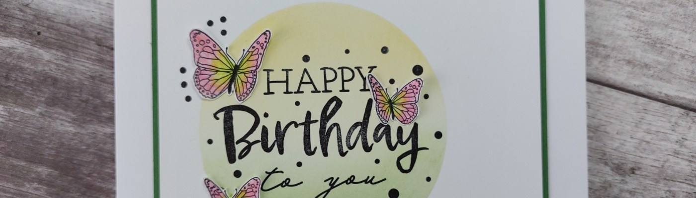 I still had the small ‘butterfly wreath’ set out from a couple of weeks ago, so stamped the butterflies onto scrap card, shaded them with pink and green Pergaliner pencils, then fussy cut them and attached them around the sentiment.
