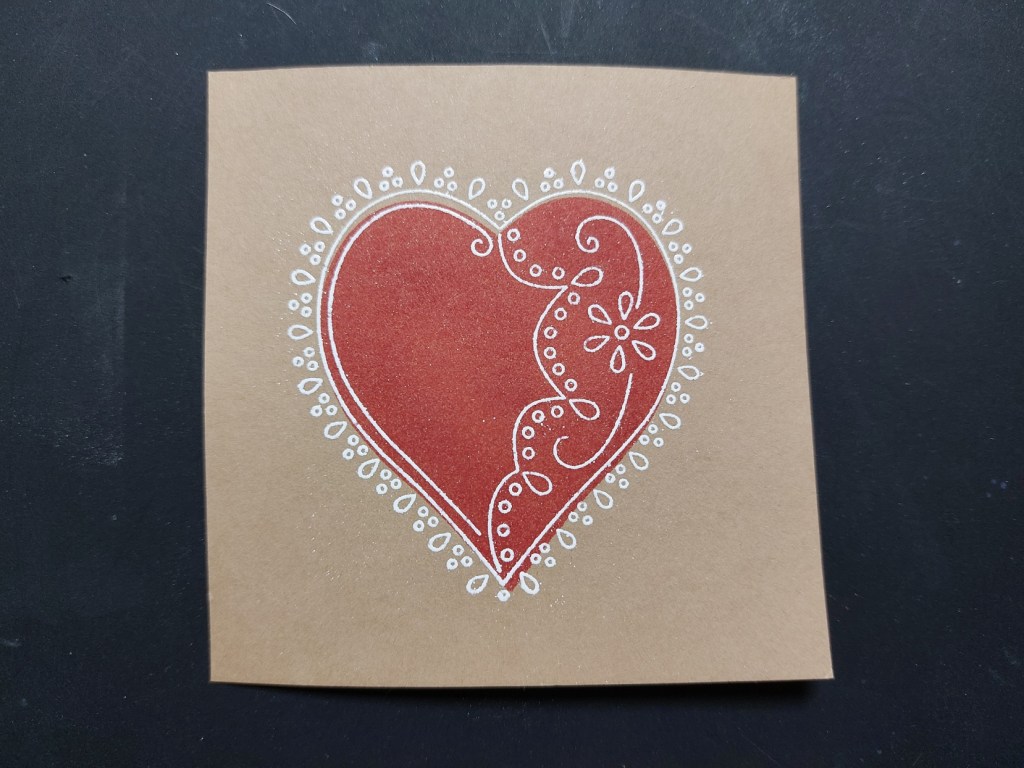 As with so many of Clarity’s stamps, this set comes with pre-cut masks for the hearts so I used the outer part of one and sponged ‘festive berries’ Distress Oxides through it onto a small square of kraft card. I made sure the ink was thoroughly dry with my heat gun, then stamped and heat embossed the floral heart over it with WOW’s superfine bright white powder.