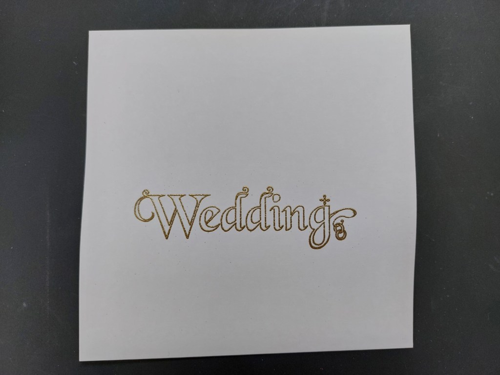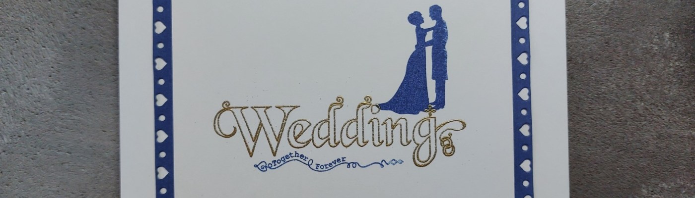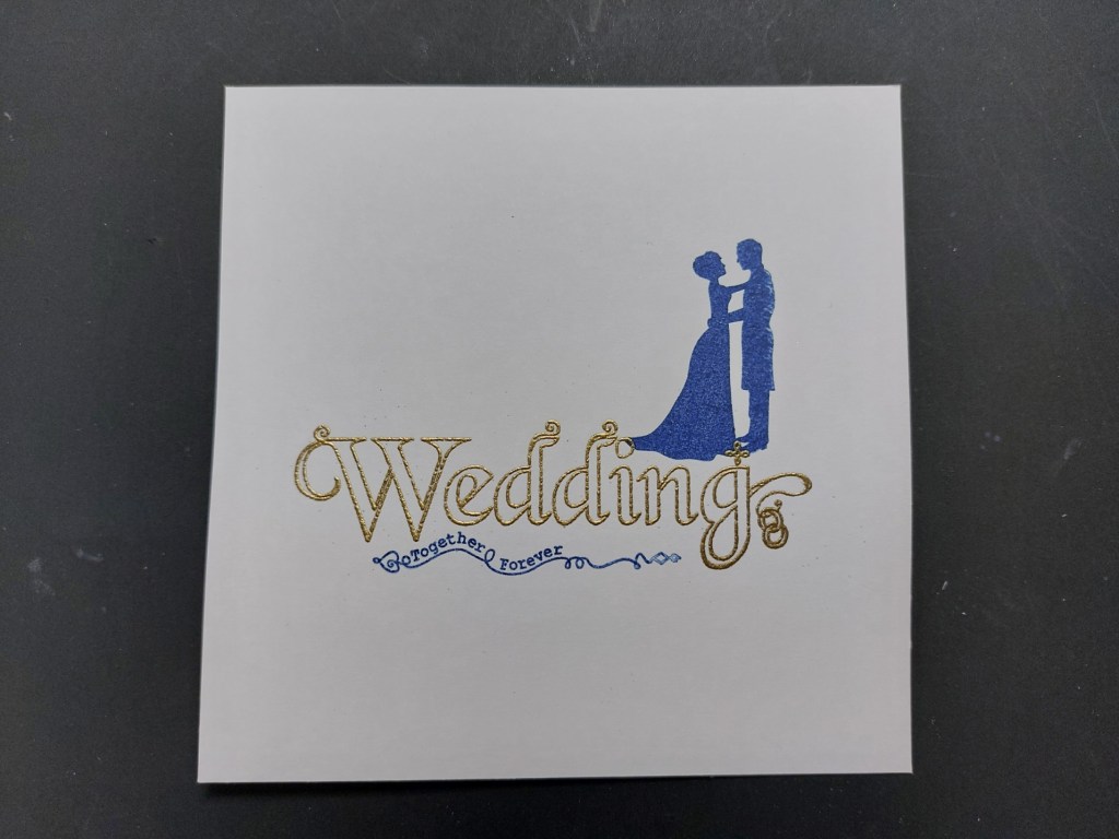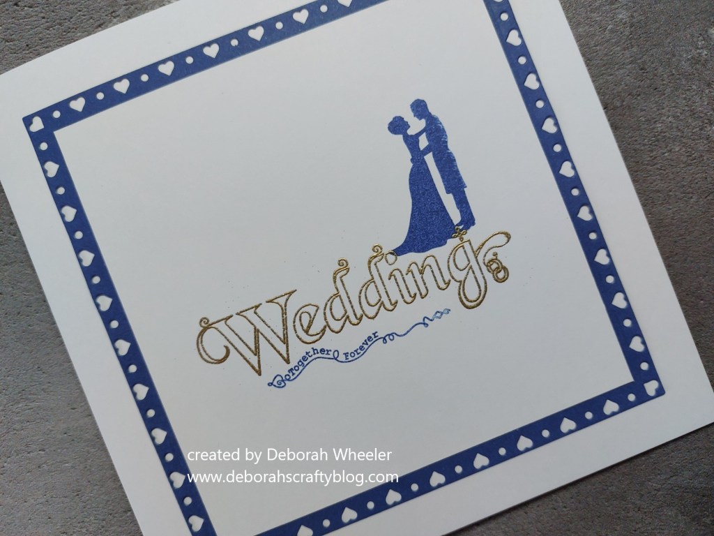 The first step was to heat emboss the dangles word onto white card, using WOW’s superfine gold metallic powder. The thing to remember about heat embossing is that it warps your card, so it’s best to leave it at least an hour (or overnight if you can) for the fibres to relax back – I tend to put my card under a heavy box to help the process of flattening it). I could then add the wedding couple and one of the sentiments from the dangles set in ‘cobalt’ Archival ink.