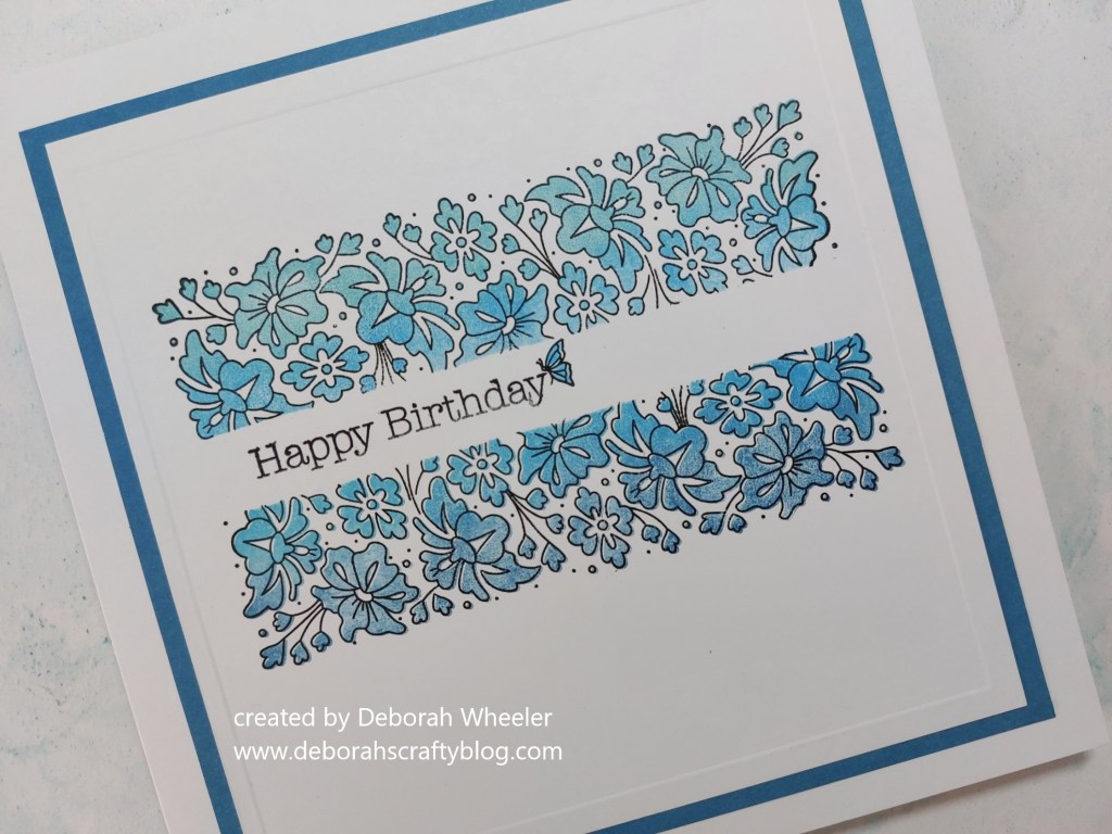 My first step was to run a strip of Clarity’s mask material across the centre of half a 6×6 card blank. I then stamped the panel outline above and below the masked strip. I blended ‘broken china’ & ‘mermaid lagoon’ Distress Oxides onto the infill stamp using a sponge and stamped it into the top panel. I then blended ‘mermaid lagoon’ and ‘uncharted mariner’ onto the infill and stamped that into the bottom panel, to give me an ombre effect running top to bottom.
