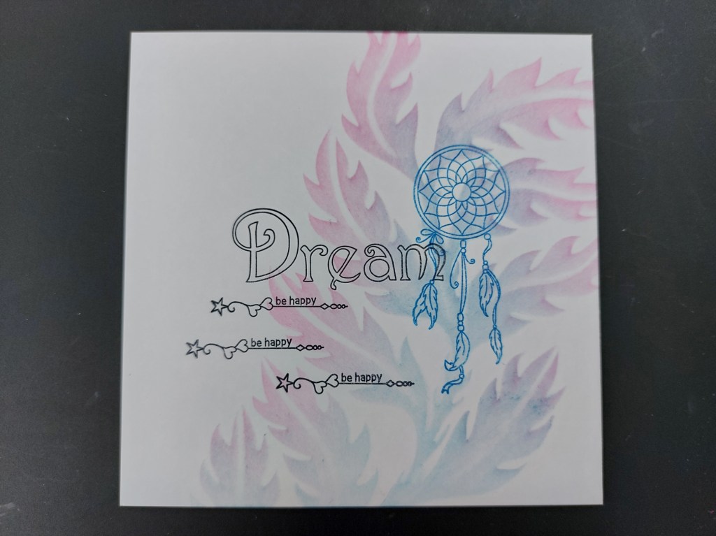 I started with half a 5×5 card blank, attached it to the back of the stencil and brushed ‘picked raspberry’ & ‘broken china’ Distress Oxides through it. One thing to be careful of when using this stencil is that the centres of the leaves are only attached at one end, so it’s best to brush in from the outer edge, which reduces the chance of them moving and blurring the image (unless that’s the effect you want!) I stamped the dreamcatcher from the set in ‘bluebird’ Archival , adding ‘dream’ and one of the small dangles in ‘watering can’ (grey).