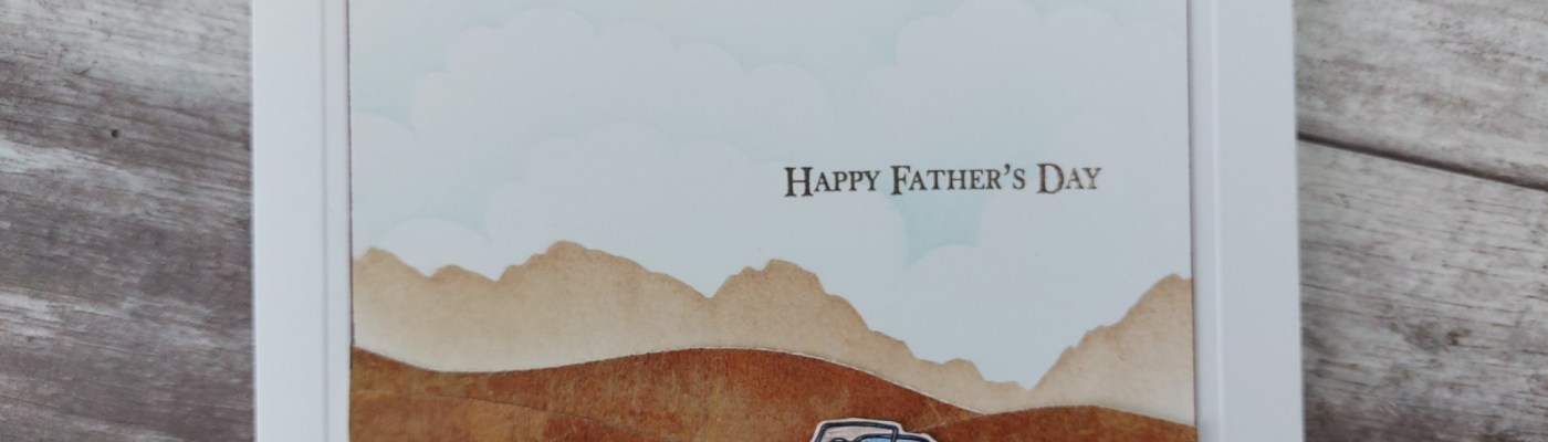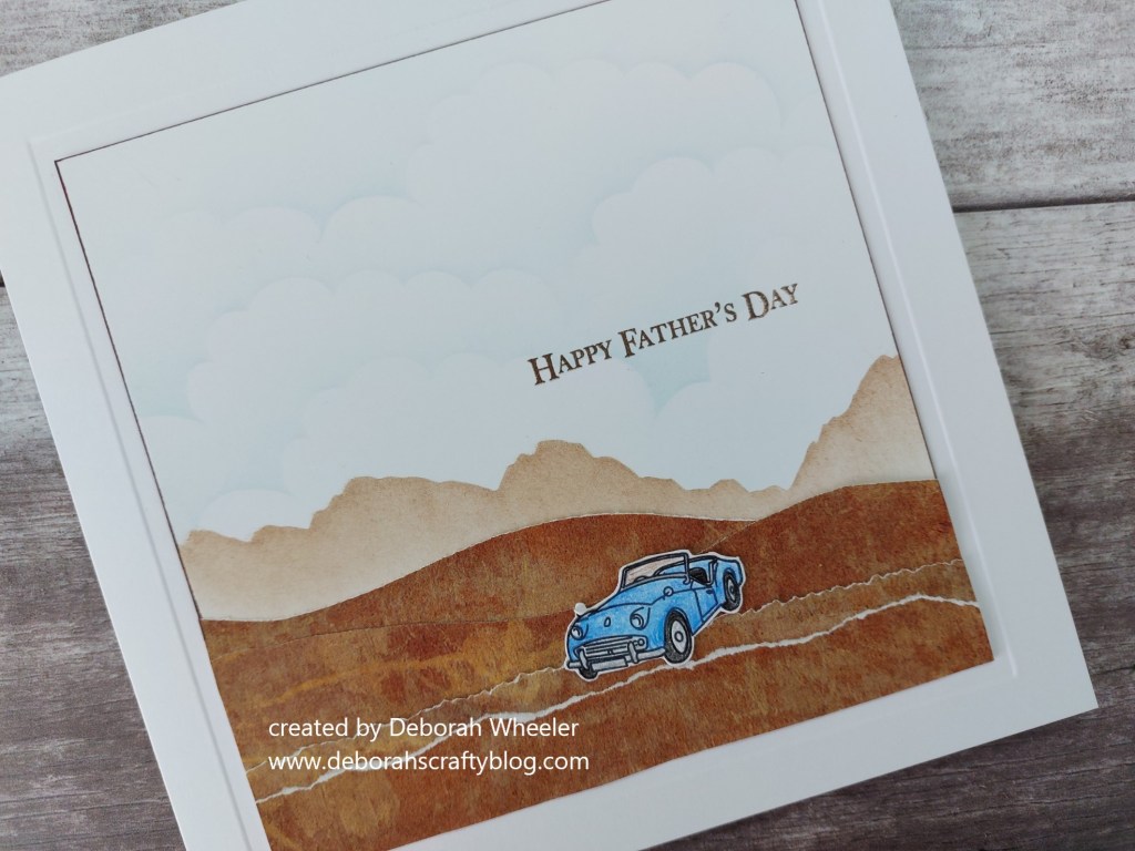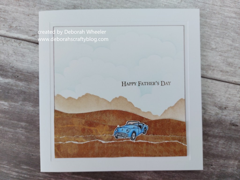 I stamped the car onto a scrap piece of card using black Archival ink, coloured it with blue Pergaliner pencils and fussy cut it. I stuck a little scrap card on the back and attached it to the card front. The finishing touches were edging the topper with a black Sharpie, creating an frame on a 7×7 card blank with a square embedder before attaching the topper, and adding a Father’s Day sentiment.