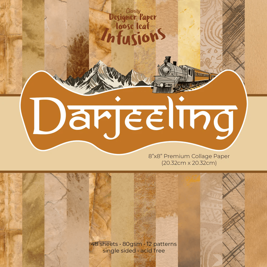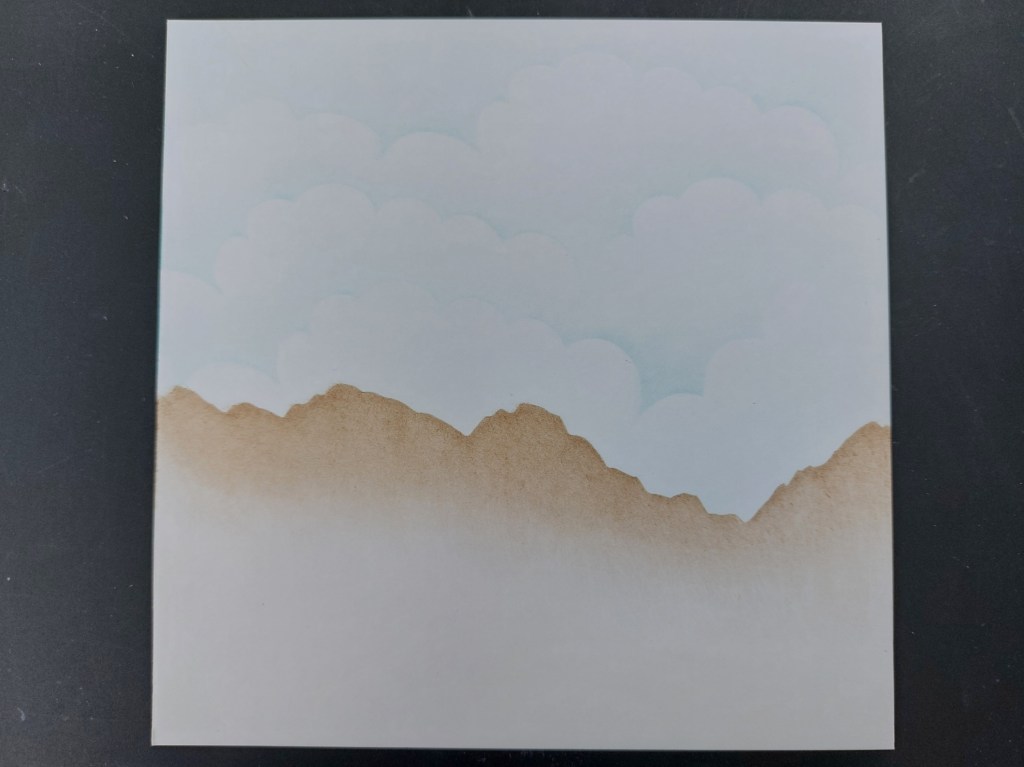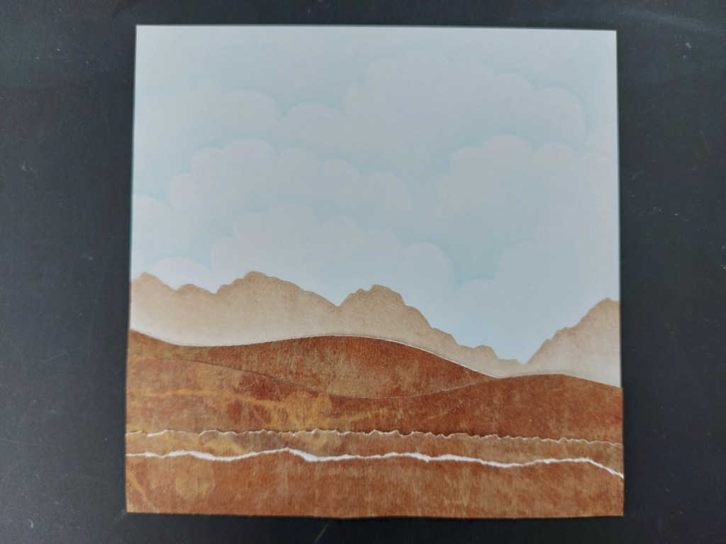 I started with half a 6×6 card blank and brushed ‘walnut stain’ Distress Oxide across the mountains mask to start the background. I then filled in the sky by blending ‘salvaged patina’ across the clouds mask. Next was to take a piece of the Darjeeling paper and tear it into strips to build up the rest of the background. I wasn’t brave enough to tear it freehand at first, so used the wavy and decked edges of Clarity’s blending mat for the first few pieces. I then gathered all my courage and tore the final piece freehand – the paper’s such good quality it was really easy! I glued the four strips together, one on top of the other and then attached the whole piece to the bottom part of the square card.