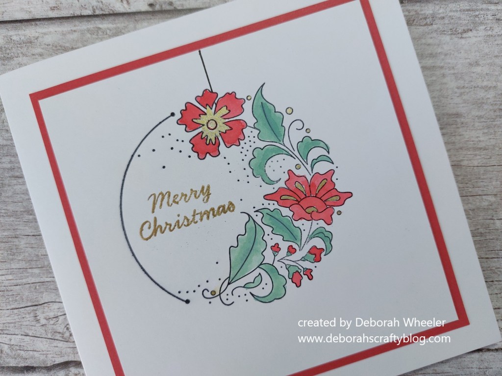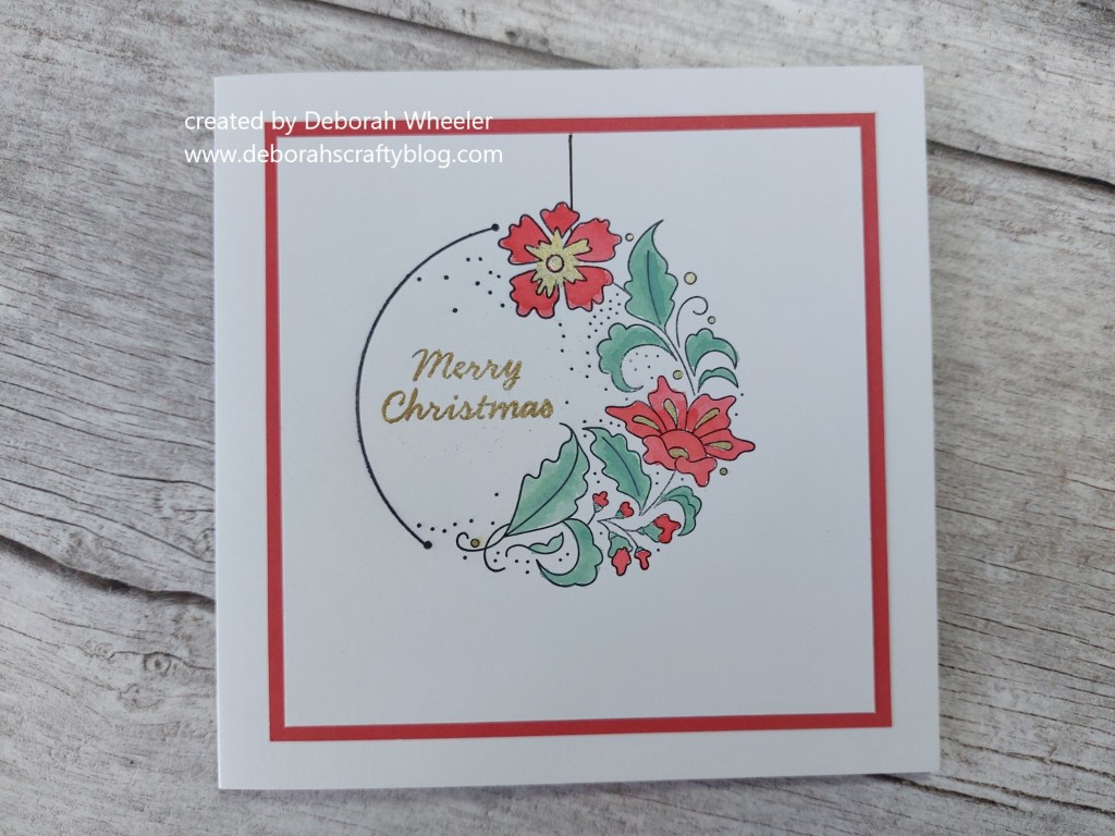 I wanted touches of gold on it to make it more festive, so used one of the metallic gel pens to colour the centres of the flowers and the little circles in the image. I heat embossed a Christams sentiment into the space, using WOW’s superfile gold metallic powder, then usied a micron pane & a ruler to add a string for the wreath to hang from. A mount of companion paper matched perfectly before the whole piece went onto a 6×6 card blank.