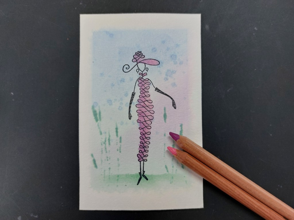 This story starts back last summer at the Clarity annual retreat, when we spent a happy session making backgrounds to stamp on. This one was from a piece of Clarity’s watercolour paper, divided up with masking tape and the colours added with a waterbrush, then splattering some dots and adding the ‘plants’ with the side of a credit card. I’ve still got a few of these in my stash so stamped one of the ladies into it, then coloured her with Pergaliner pencils and sponged a little ‘lucky clover’ Distress Oxide across a torn bit of copy paper to give her some ground to stand on.