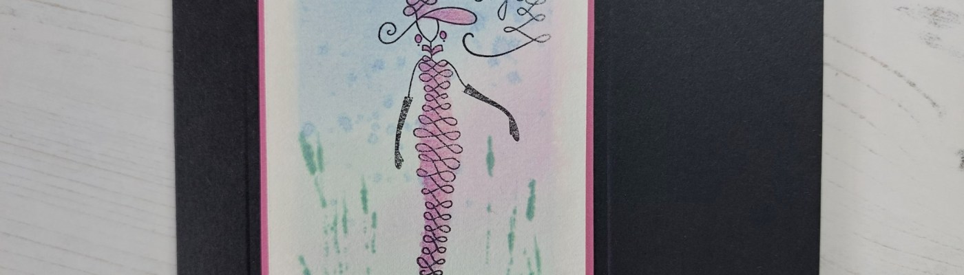 This story starts back last summer at the Clarity annual retreat, when we spent a happy session making backgrounds to stamp on. This one was from a piece of Clarity’s watercolour paper, divided up with masking tape and the colours added with a waterbrush, then splattering some dots and adding the ‘plants’ with the side of a credit card. I’ve still got a few of these in my stash so stamped one of the ladies into it, then coloured her with Pergaliner pencils and sponged a little ‘lucky clover’ Distress Oxide across a torn bit of copy paper to give her some ground to stand on.