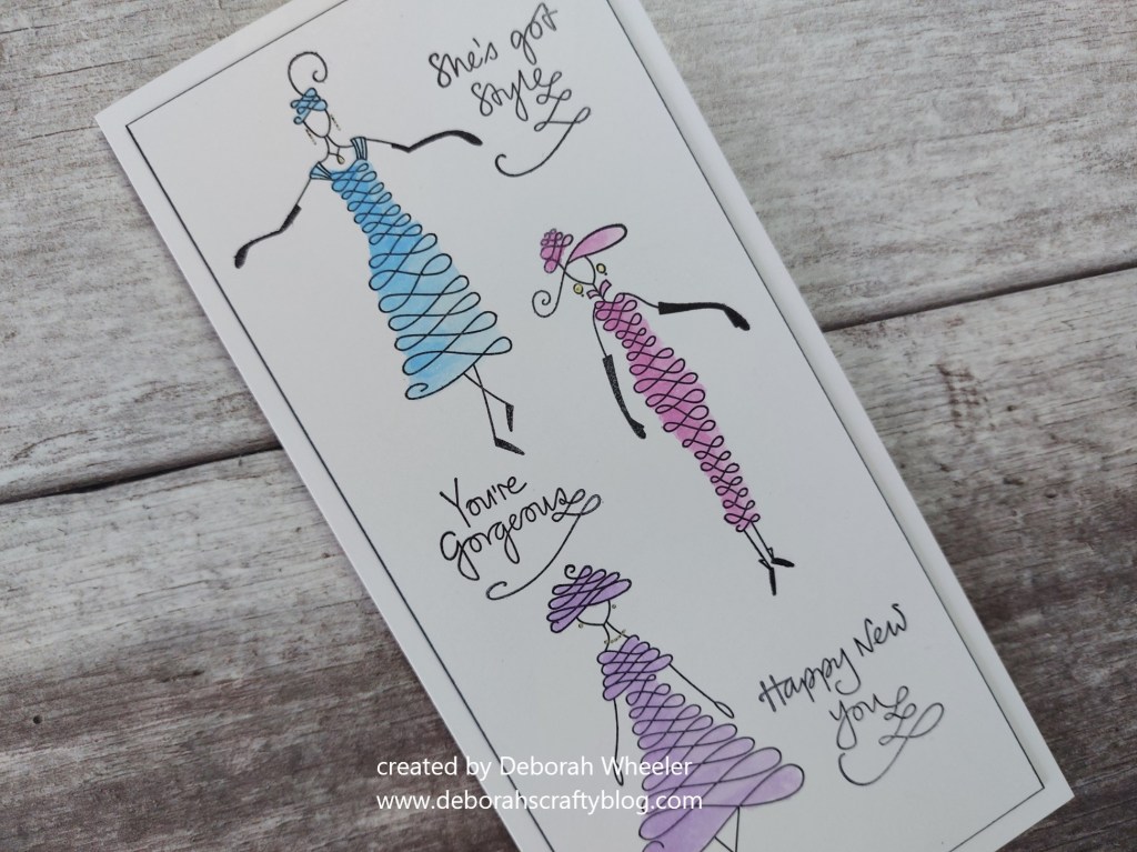 So for this one, I stamped the three ladies and the sentiments onto a piece of card I’d cut down to fit a slimline card (UK DL size), using black Archival ink. I coloured their outfits using Pergaliner watercolour pencils, scribbling the pigment onto one of Clarity’s mix mats then picking it up with a waterbrush.