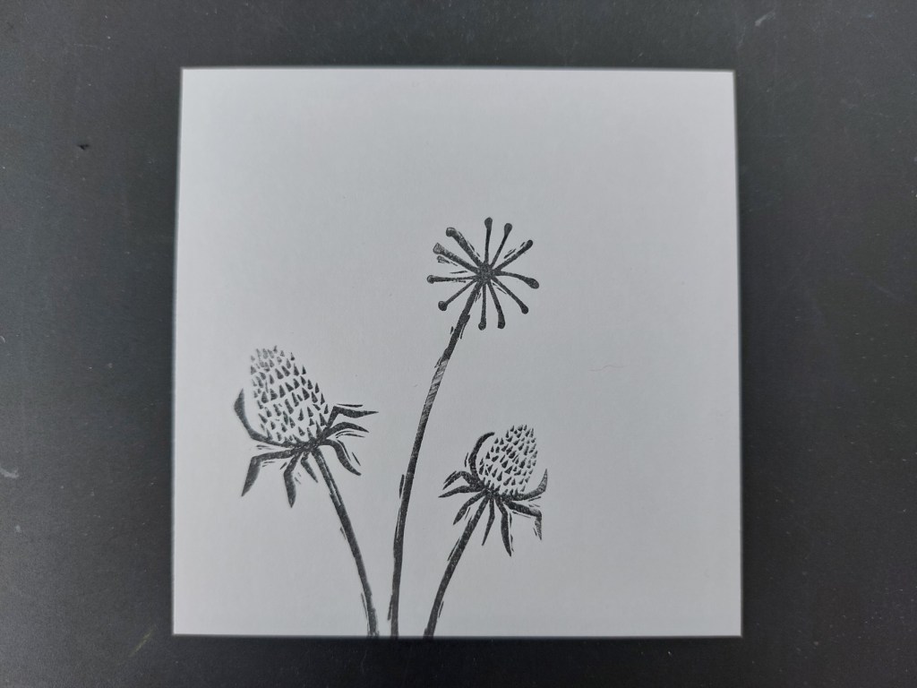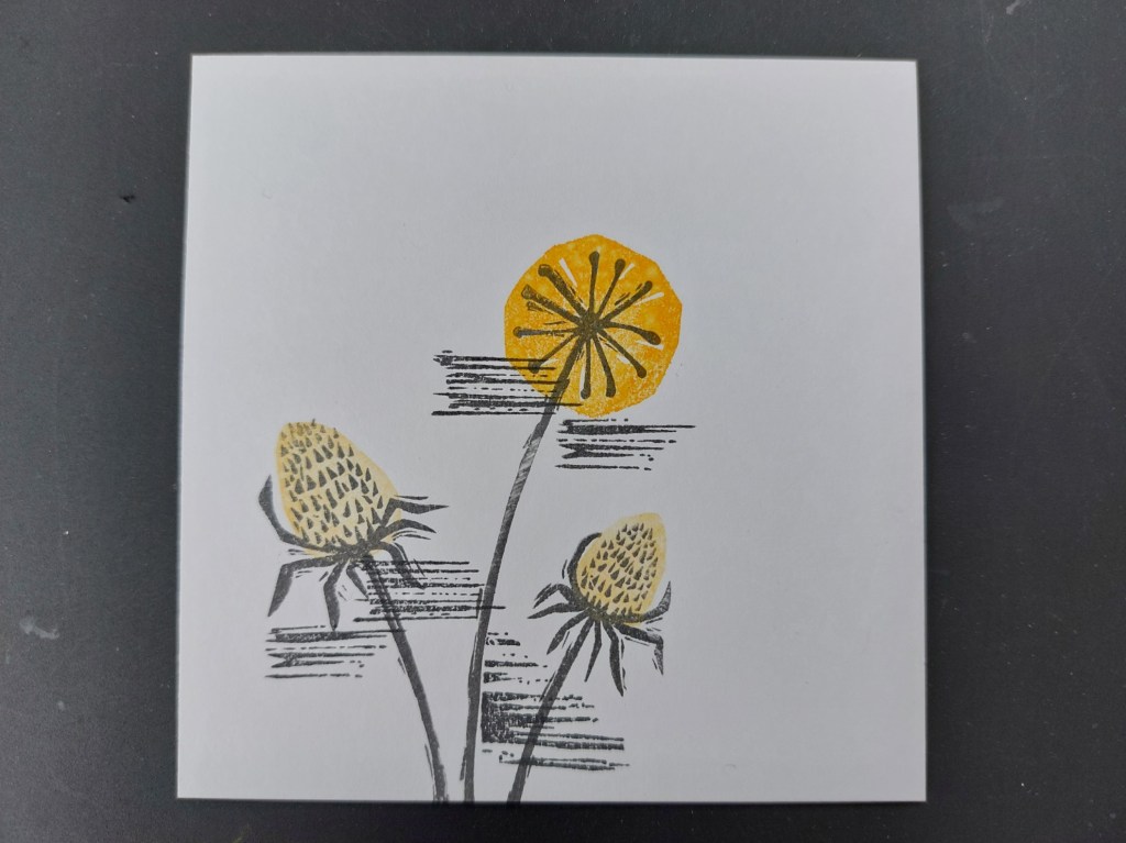 Hello crafty friends and welcome to what will be my last post for a while – this little blog and I are taking a bit of a break for a few weeks. I thought I’d go out in style with another card using the new ‘bijou linocut’ stamps from ClarityCrafts, this time with the ‘teasels’ set. I’m going to share it with AAA cards for their sketch and Seize the Birthday as an ‘anything goes’ contribution.
