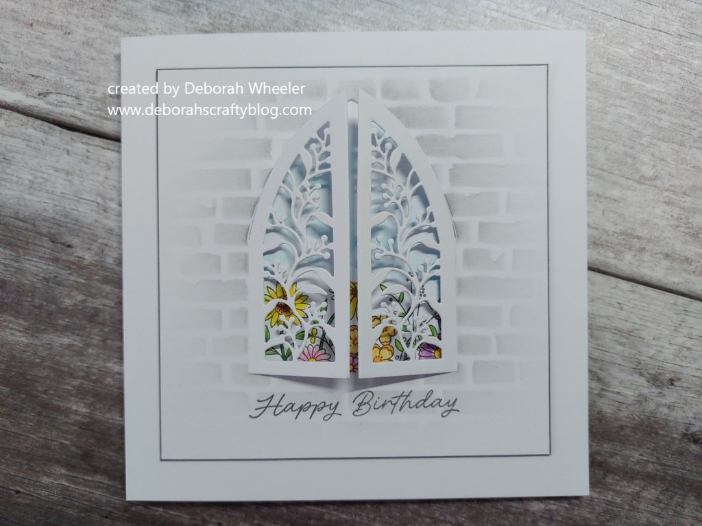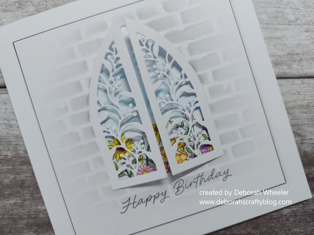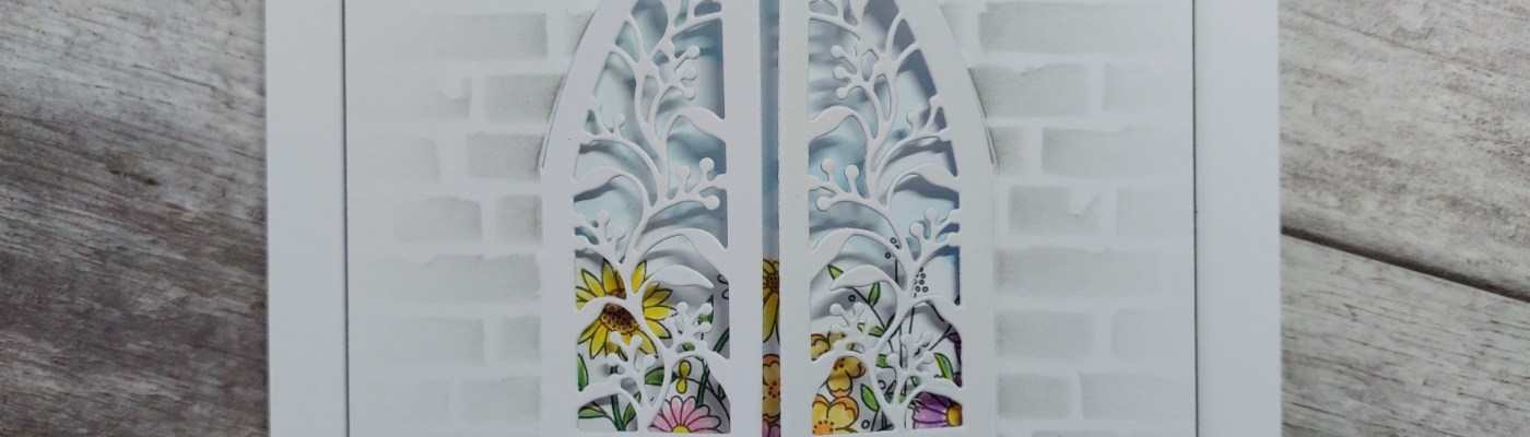 Hello friends. TIme for a new challenge at Love to Craft – as always the theme is ‘anything goes’. The summer days are now here (Wimbledon starts today), so I’ve gone for a garden window view on my card, using one of ClarityCrafts ‘floral walls’ with their decorative panel window dies.