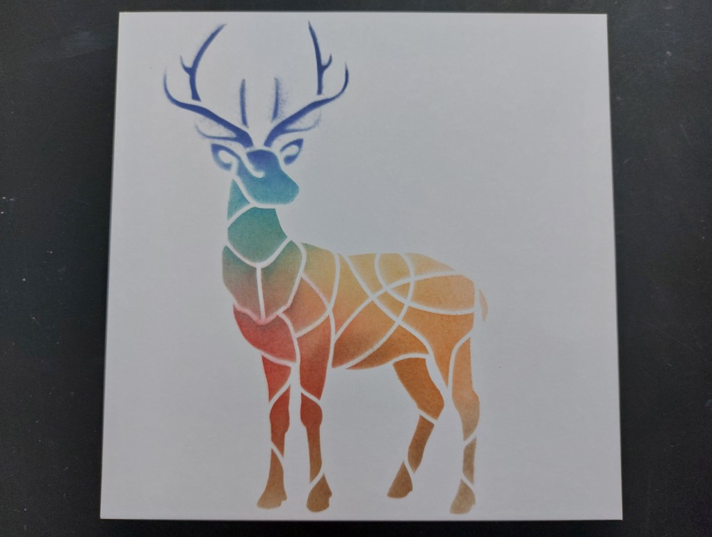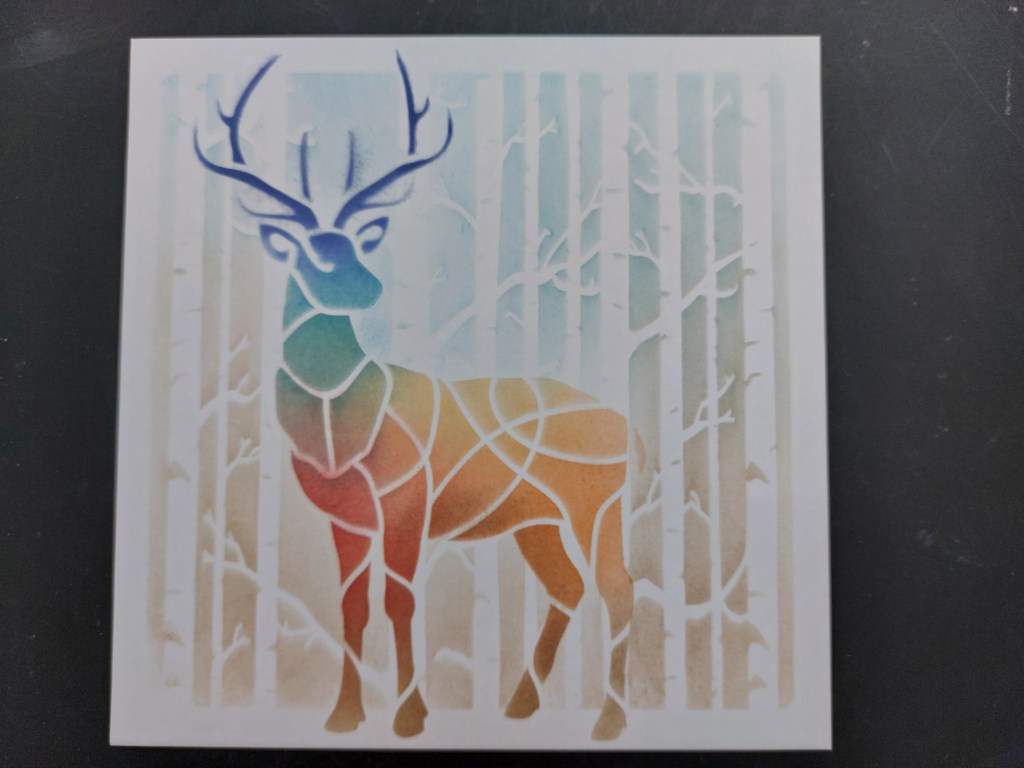 To start, I simply laid the stag onto a piece of 7×7 stencil card and started brushing Distress Oxides into the design. Working from the hooves up, I use ‘walnut stain’, ‘festive berries’, ‘ripe persimmon’, ‘dried marigold’, ‘broken china’ and ‘chipped sapphire’! I got a little bleed around his antlers from the ink, but thought I could probably disguise that with the background…