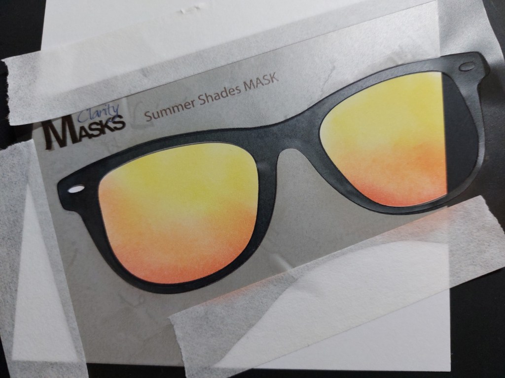 I’ve CASE’d (Copy and Selectively Edit) a design I saw on social media, adapting it for a square card . The first step was to stamp the frames with Versafine black ink onto stencil card cut to fit a 6×6 card blank. I used the precut masks to cover them, together with the outer mask material, which meant I could create little scenes inside the lenses. I then used Spot-On sponges to blend ‘festive berries’, ‘ripe persimmon’, ‘dried marigold’ and ‘squeezed lemonade’ Distress Oxides into the frame, aiming for a summer sunset look.