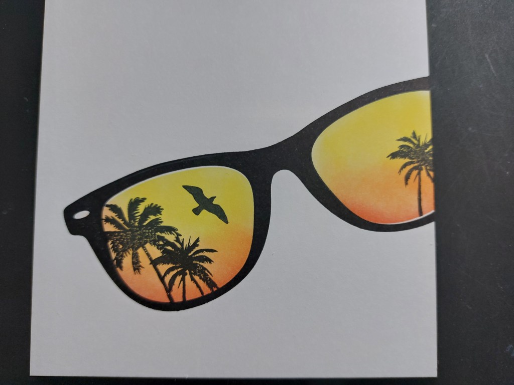 A crafter’s desk and tools are a hazard zone! I’ve suffered several mishaps like that! What’s important is how you dealt with it and your card is amazing! I love the point of view – looking at the view in the reflective lens of the sunglasses! Great sentiment, too!