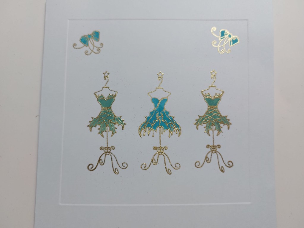 I strated by creating a frame on the front of a 6×6 card blank using one of the square embedders. I stamped the dresses on stands and heat embossed them with WOW’s superfine gold powder – top tip: run a piece of low tack tape across the card to give you a guideline to line up the base of the images. I added a couple of bows in the corners and then used ‘evergreen bough’ and ‘peacock feathers’ Distress Oxides with a water brush to colour in these fab little dresses and bows.